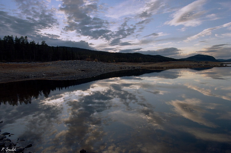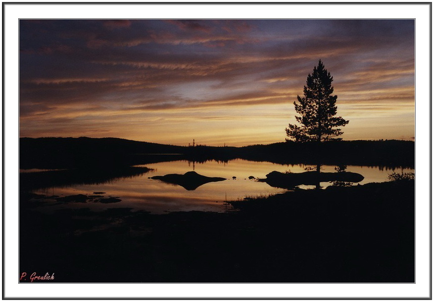 Hier mal wieder was aus dem Norden. Das Bild ist während eine Kanutour in Westjämtland am Anjan See entstanden. Eine wunderschöne (wenn man diese Art Landschaft mag) menschenleere und wilde Gegend. An dieser Stelle hatten wie unser Lager aufgeschlagen. Ein zauberhaftes Farbenspiel der Wolken am Abendhimmel, gespiegelt im Wasser, entschädigte uns für die Beißattacken von Bremsen, Mücken, Gnitzen und Kriebelmücken, die sich mit ihren Angriffen abwechselten.