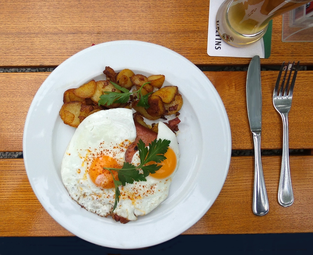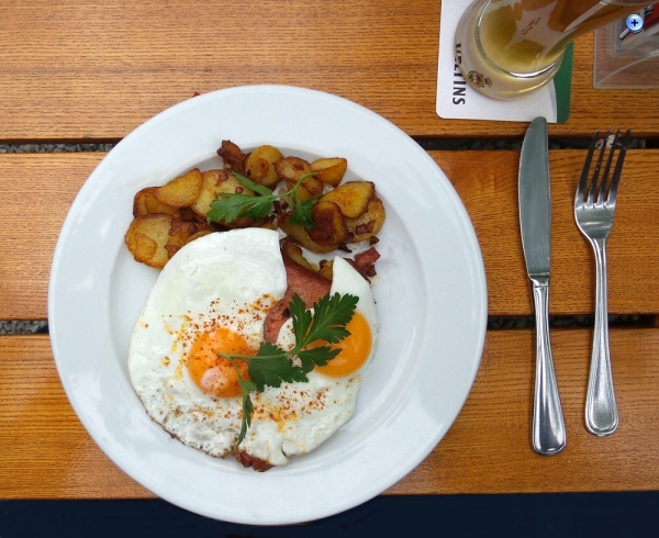 Leberkäse mit 2 Spiegeleiern und Bratkartoffeln für 7,80 EUR, dazu ein Hefeweizen (ohne Alkohol)