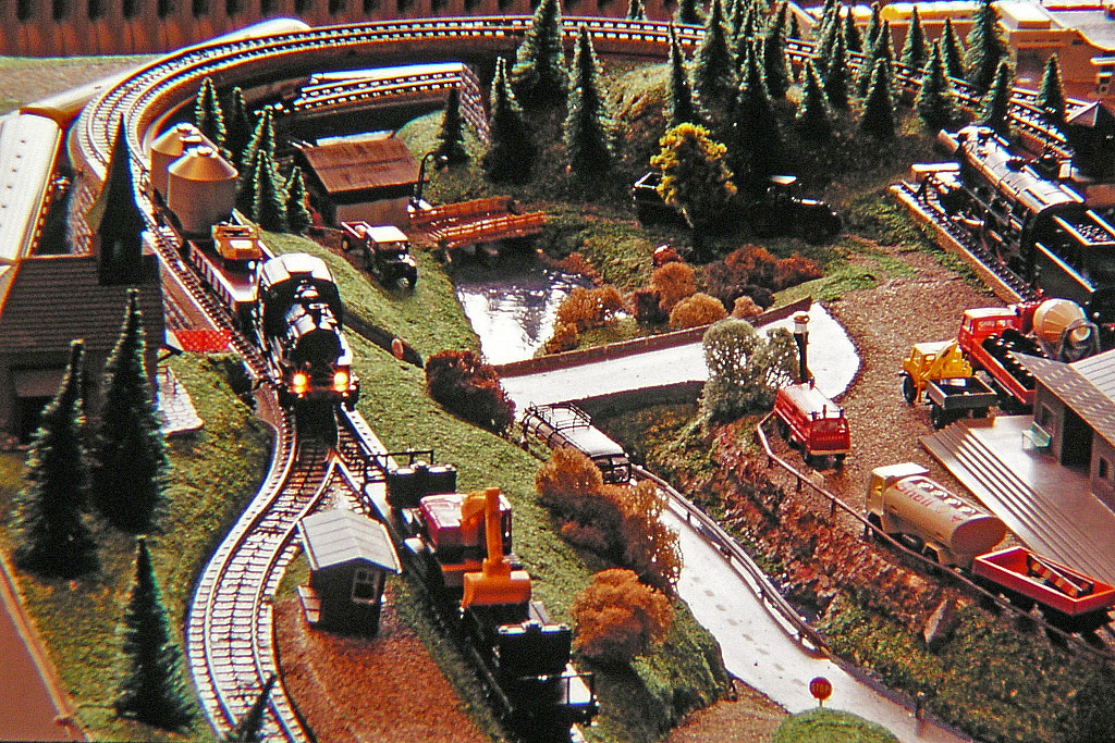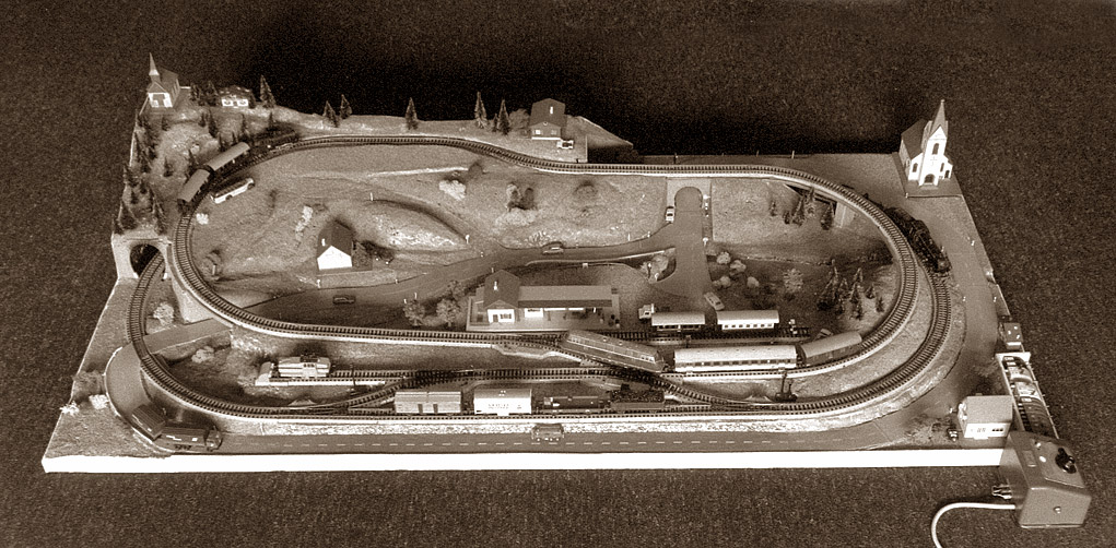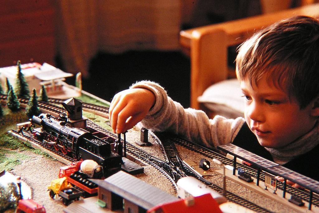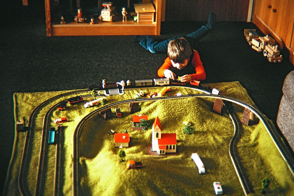 Meine temporär auf einer grünen Decke aufgebaute Märklinbahn aus dem Jahr 1955 hat den Fünfjährigen fasziniert...