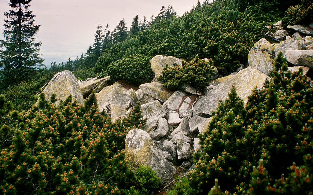 Die Latsche (Legföhre, Kiefer) versucht als Vegetationspionier die Steinfelder zu überwachsen. Nikon FE2, Nikkor 135 mm, Ektachrome 100