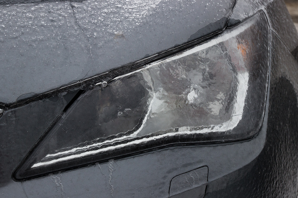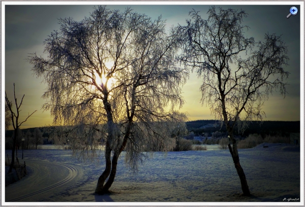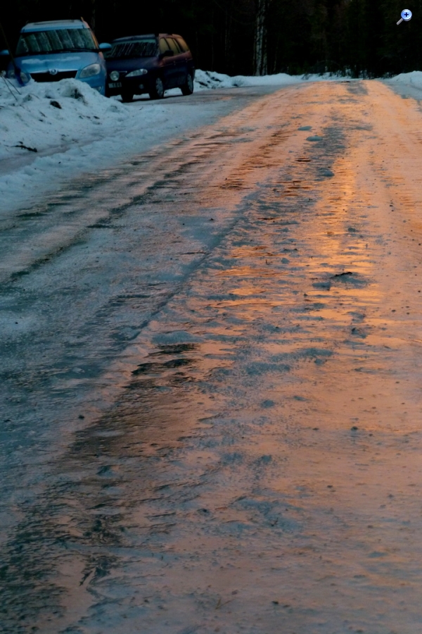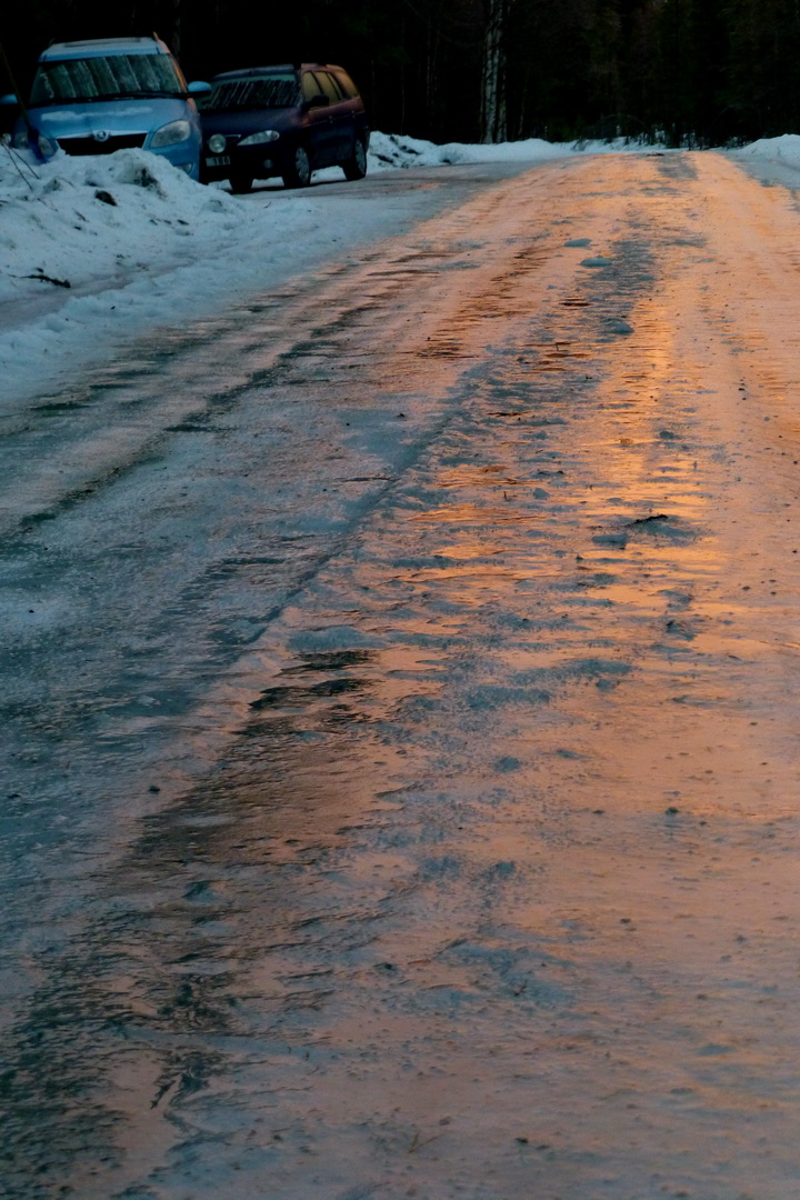 Anfang Dezember hatten wir sowas auch hier. Regen auf Eis. Zur Arbeit fahren war nicht möglich diesen Tag. Wir kamen noch nichtmals vom Parkstreifen runter, trotz Spikes. Was man hier von der aufgehenden Morgensonne angeleuchtet rötlich schimmern sieht, ist eine mehrere Zentimeter dicke Eisschicht mit einem Wasserfilm darauf. Eigentlich ist das eine Schotterstrasse. An diesem Tag war für fast ganz Jämtland und Härjedalen im Radio die höchste Gefahrenwarnstufe für den Strassenverkehr ausgerufen worden und auch öffentliche Verkehrsmittel fuhren nicht mehr. Die Postausteilung wurde ebenfalls eingestellt.