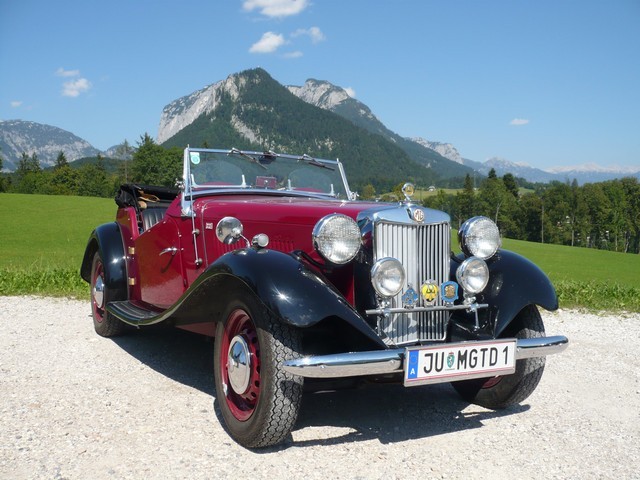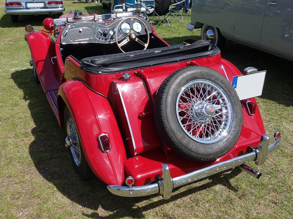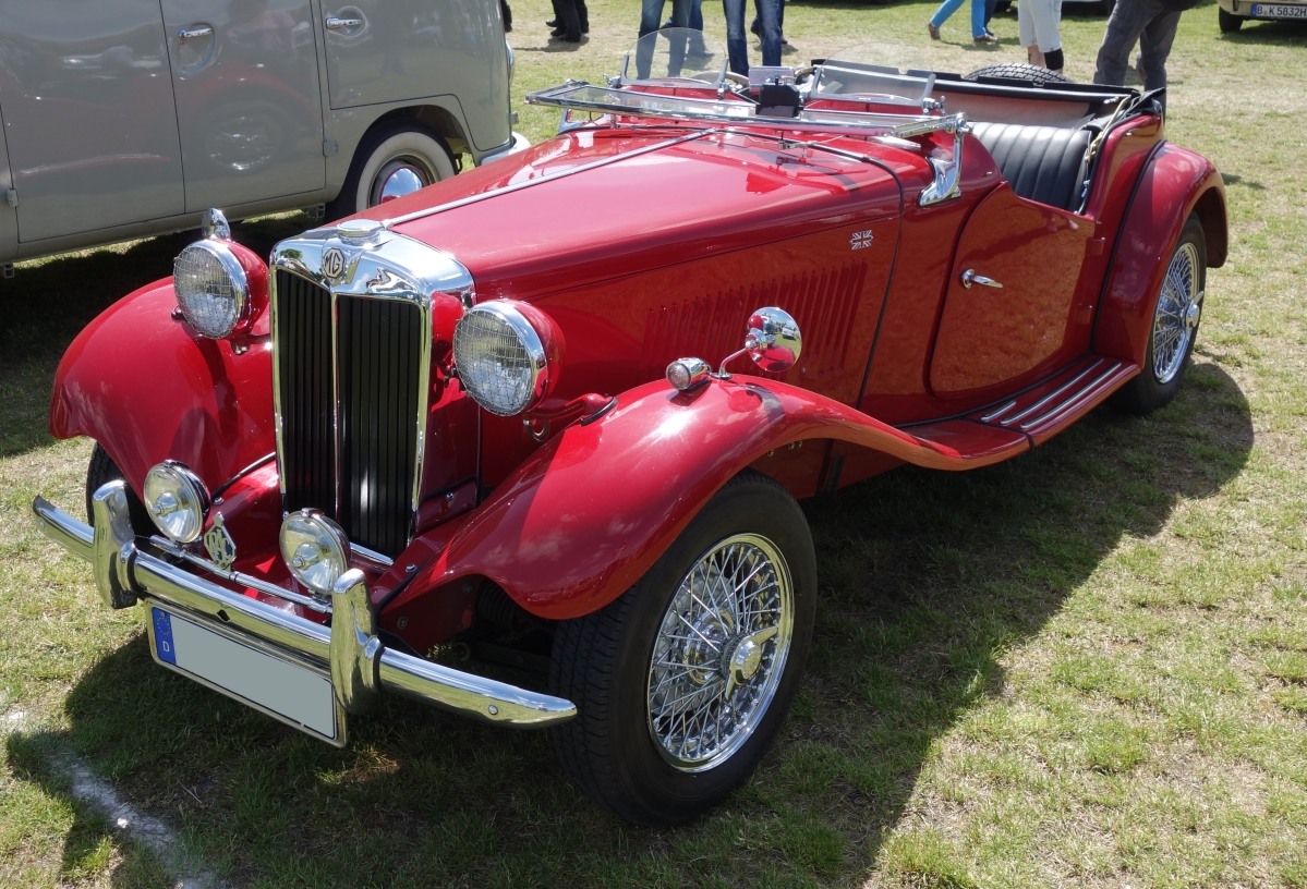 MG, Modell TD Roadster, 1953 ? Die Zusatzscheinwerfer bei dem gezeigten Modell sind sehr weit vorn. Bei den meisten im WWW gezeigten Fahrzeugen sind diese Zusatzscheinwerfer etwas weiter nach hinten in Richtung Kühler montiert.