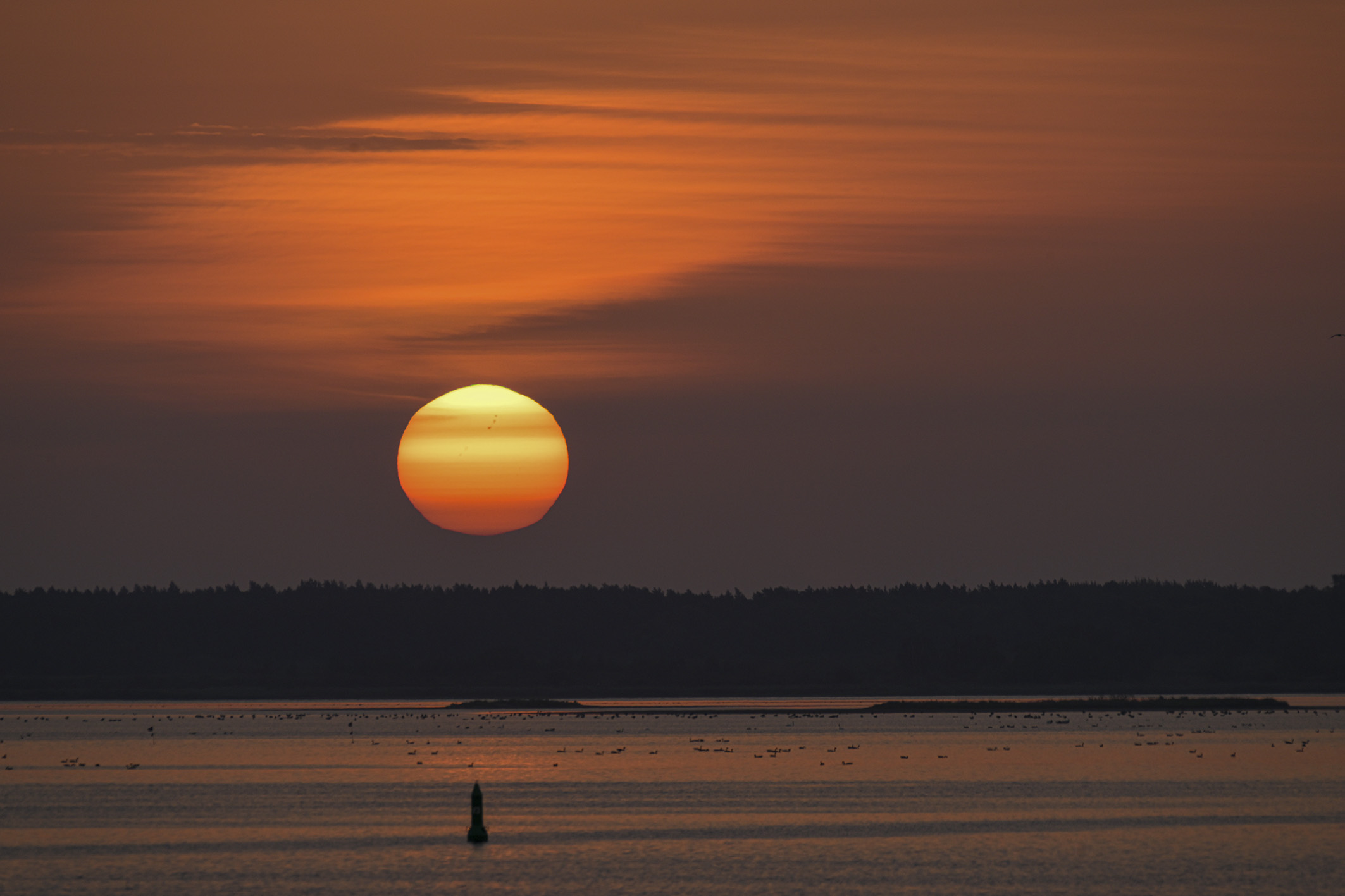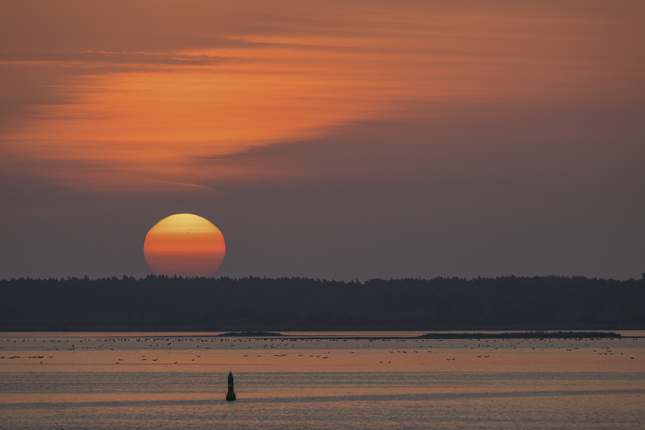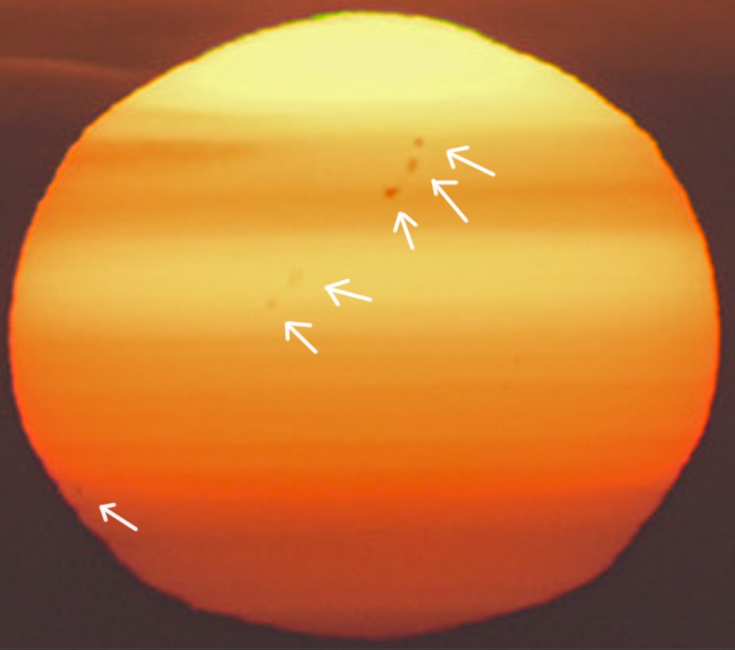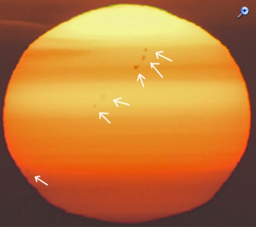 vor etwa 14 Tagen der Blick aus dem Fenster meiner Ferienwohnung auf Hiddensee aufgenommen. Chronologie eines Sonnenaufgangs über Rügen - bei schnellem Schalten wirkt es wie ein Daumenkino. Auf der Sonne sind 3 Flecken zu erkennen. Da sie auf allen Bildern an der gleichen Stelle sind, die Sonne sich räumlich bewegt hat, können es keine Vögel, Sensorflecken o.ä. sein. So vermute ich, es handelt sich um Sonnenflecken.