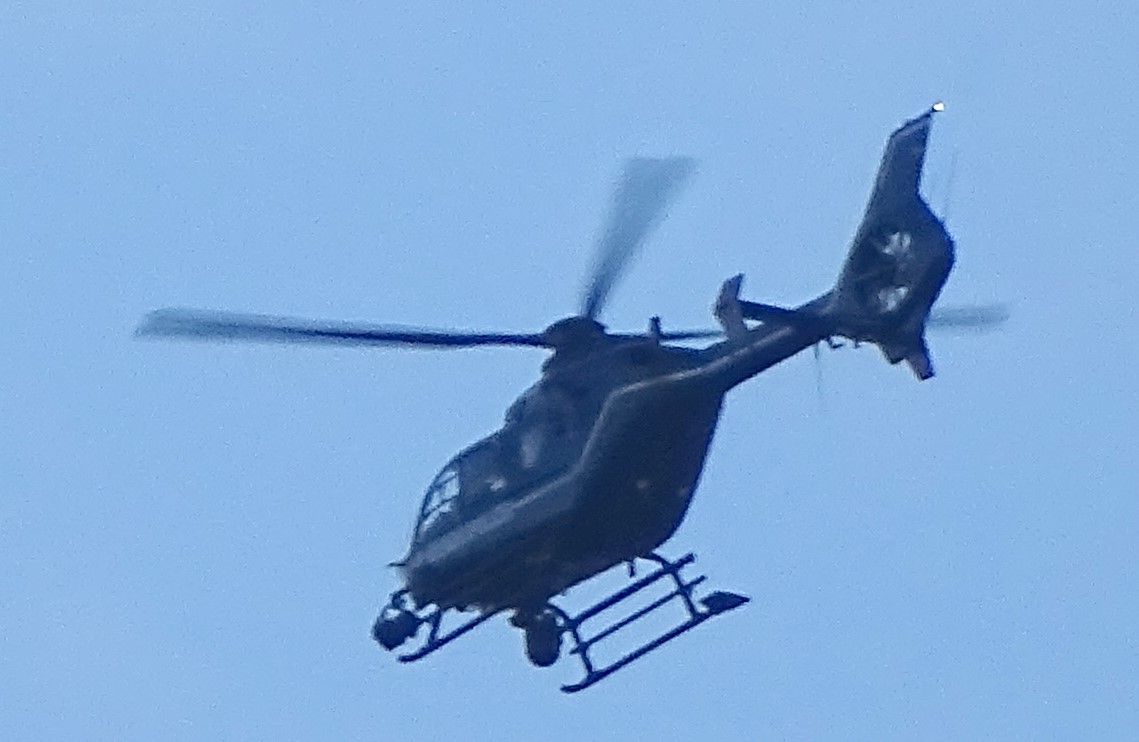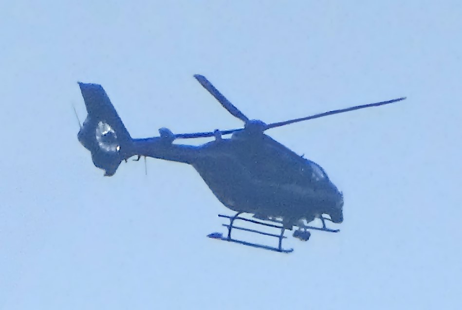 na ja, ein Hit ist das Foto nicht, aber eben auch deshalb interessant, wenn es darum geht innerhalb einer Minute einen von rechts kommenden Hubschrauber irgendwie abzulichten, am frühen Abend, Maschine ca. 500 Meter entfernt. Ablauf: Auf dem Balkon sitzend, Hubschrauber gesehen, aufgesprungen, rein ins Zimmer, nächste Kamera gegriffen, die einen brauchbaren Zoom hat (Sony DSC-HX400) , raus auf den Balkon, dabei Kamera eingeschaltet, Zoom auf Maximum, durch Sucher schauen, auslösen.