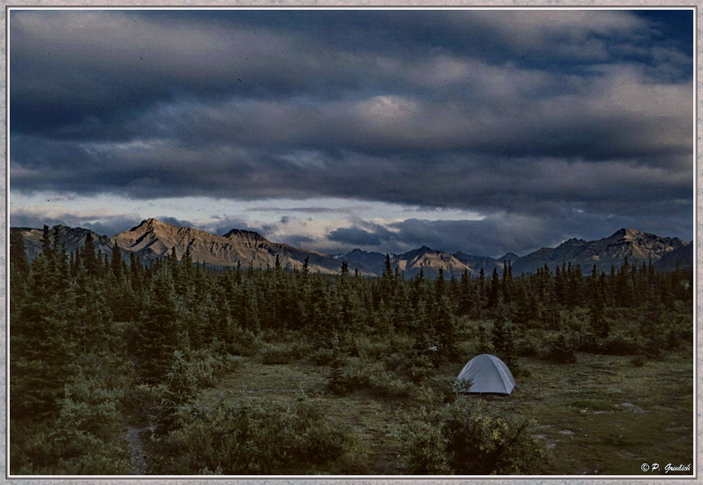Das Bild entstand 1991. Ich hatte mein Zelt im Denali Nationalpark aufgeschlagen. Geht man durch die Bäume rechts aus dem Bild, kommt man nach ein paar hundert Metern an einen flachen Fluss. Genau dort hatte ich am selben Abend noch eine Begegnung mit einem Grizzly Bären in einer Distanz von deutlich unter hundert Metern.