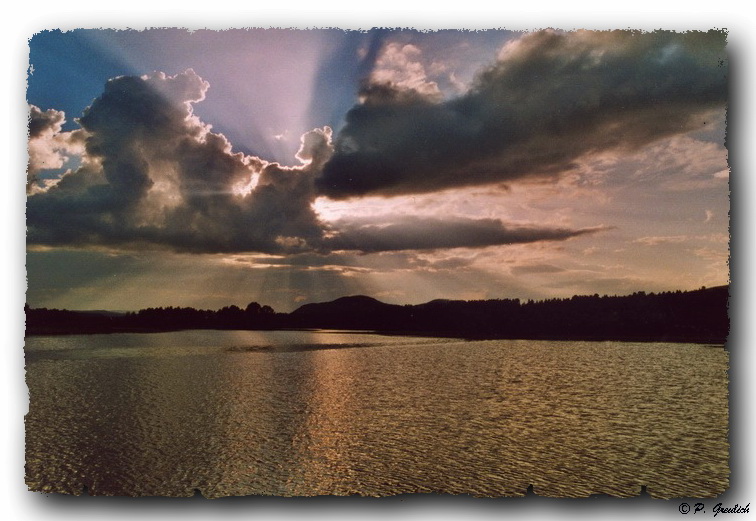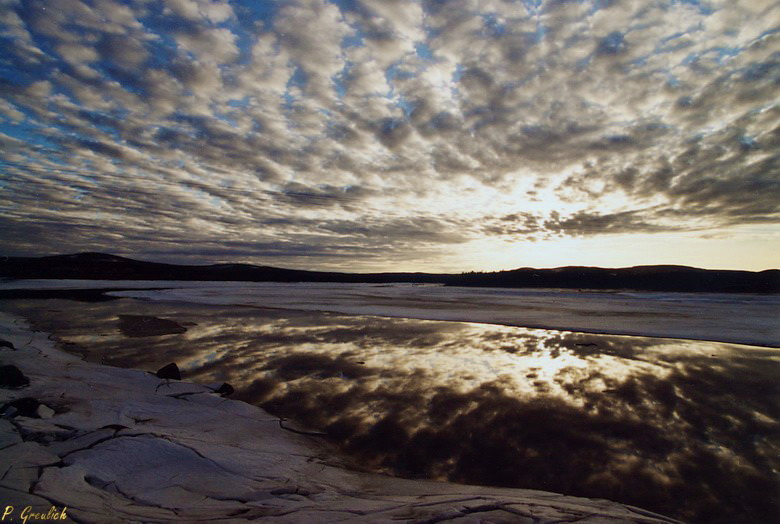 Das Bild ist vor sechs Jahren entstanden. Ich war zu einer Einarbeitung zwei Wochen an einem anderen Ort und hatte mir dort eine Ferienwohnung in einem nahegelegenen Dorf als Unterkunft gemietet. Als ich bei einem Abendspaziergang an einem auftauenden See vorbeikam, standen ungewöhnliche Wolken am Himmel, die sich im glatten Wasser spiegelten. Klick!