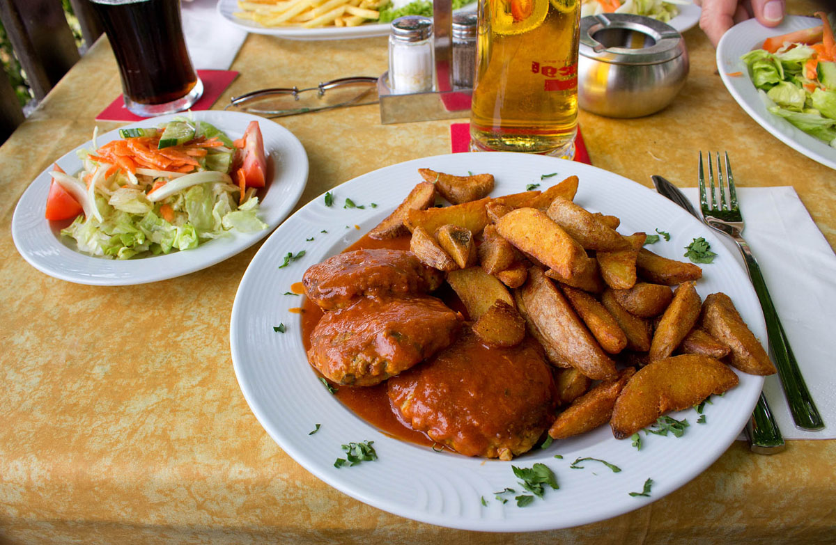 ... oder Keftedakia, faschierte Leibchen mit Tomatensoße und Bratkartoffel