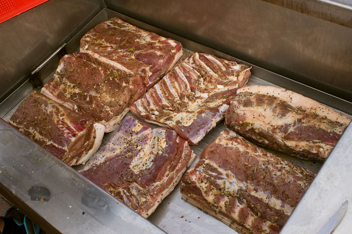 In einer Stahlwanne liegen ca. 30 - 40 kg gesalzenes und gewürztes Schweinefleisch in großen Stücken.