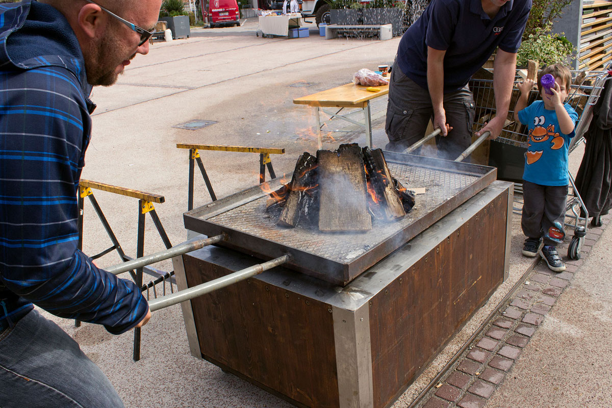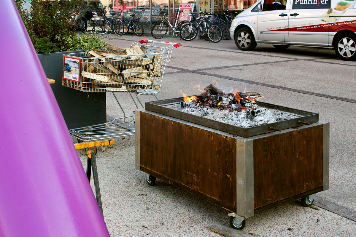 Eine dickwandige Holzkiste, die innen mit Edelstahlblech ausgeschlagen ist dient als "Kochgerät". Die Kiste ist mit einem Stahlblechdeckel verschlossen, auf dem ein Holzfeuer brennt.