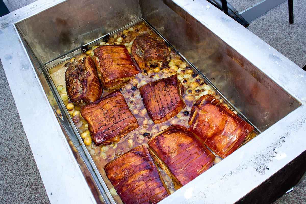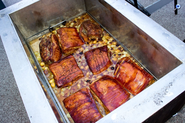 Wie kann man für rund 100 Leute beim Dorffest ein deftiges Essen zubereiten, das für alle fast gleichzeitig fertig ist? Bei uns im Donautal bereitet man dazu die "Kistensau" zu.