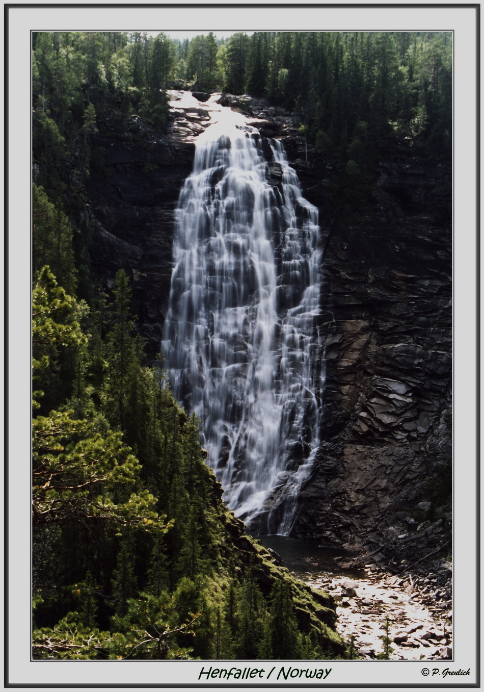Henfallet nennt er sich. Mit einer Fallhöhe von ca. 90 Metern ist er der höchste Wasserfall der norwegischen Kommune Tydal in der Provinz Sör Tröndelag.