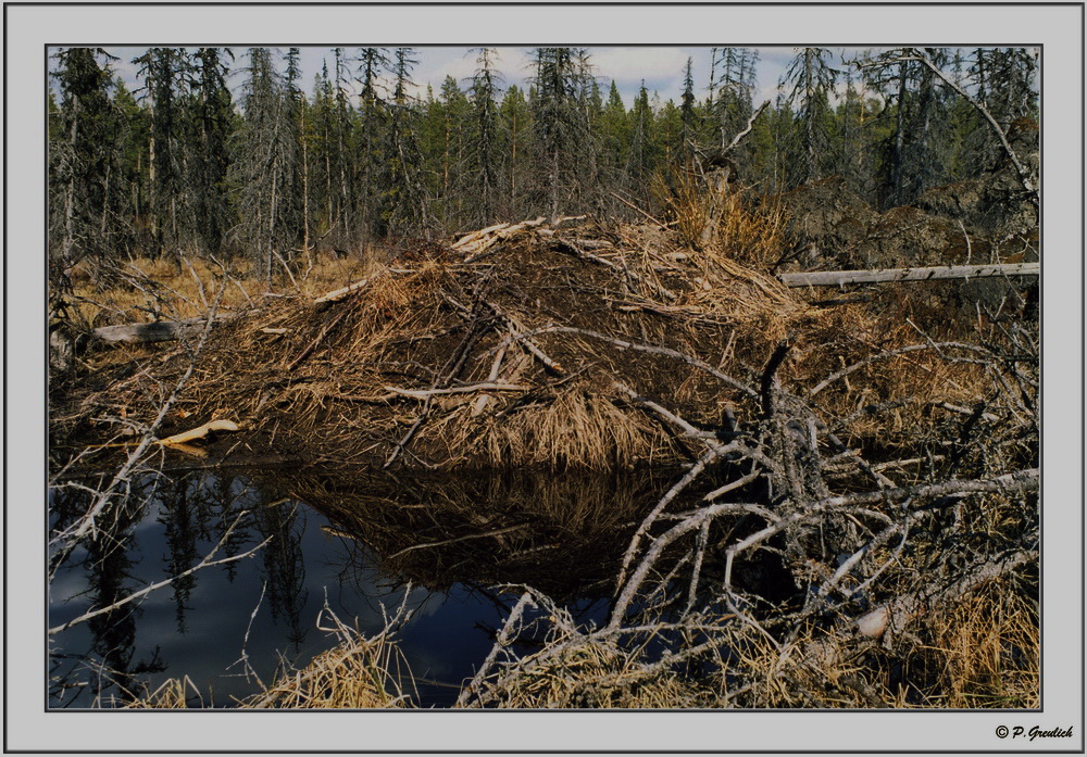 Hier nochmal eine Biberburg. Ich habe sie vor einigen Jahren aufgenommen. Mittlerweile existiert sie nicht mehr. Dieser Biber war ein ziemlich fauler "Kerl". Er hatte einfach das Abflussrohr eines Baches unter einem wenig befahrenen Schotterweg verstopft und war so bequem zu seinem eigenen kleinen See gekommen. Irgendwann hat dann irgendjemand den Abfluss wieder in Ordnung gebracht und diese prächtige Burg zerstört. Welches Schicksal der Biber erlitt, kann ich mir lebhaft vorstellen. Peng!