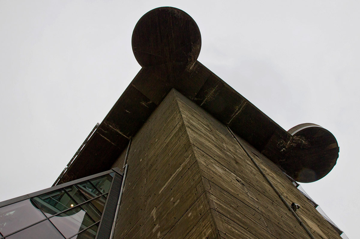 Der 47 m hohe Turm mit den Zubauten der letzten Jahre. Im Aufbau, der heute mit Texten des Künstlers Lawrence Weiner als Mahnung gegen Krieg und Faschismus versehen ist, war einst der sogenannte Würzburg-Riese FuMG65, die leistungsfähigste Radaranlage dieser Zeit, montiert.