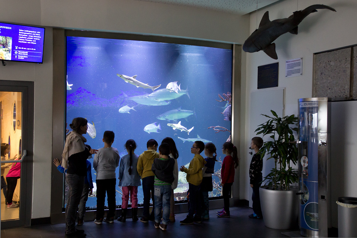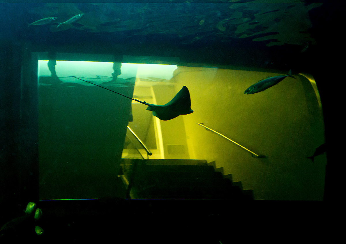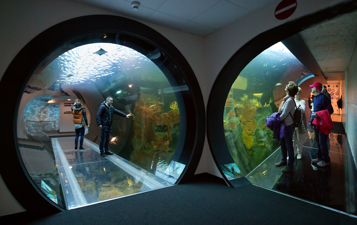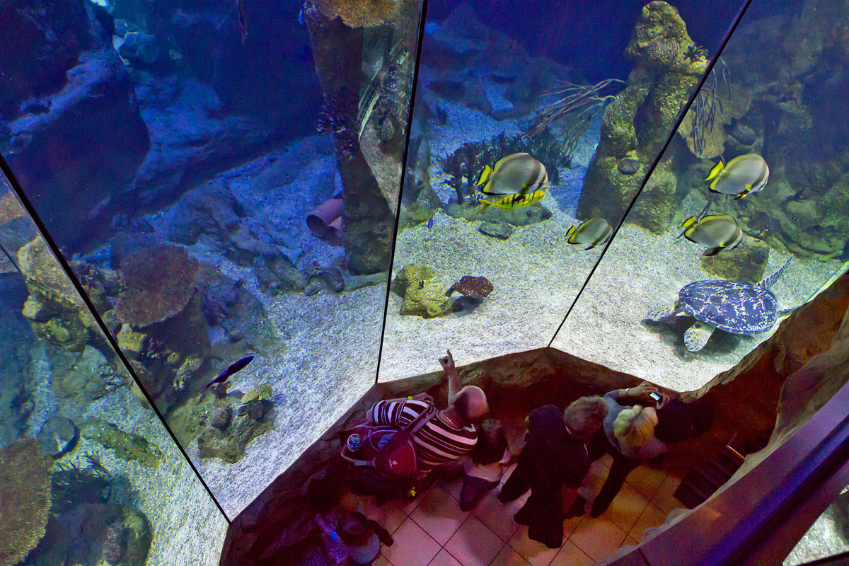 In den Untergeschoßen bietet ein Meerestunnel im 550.000 Liter fassenden Becken eindrucksvolle Ausblicke