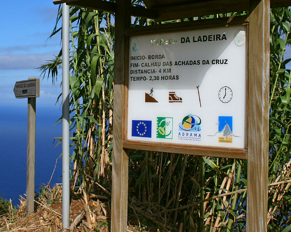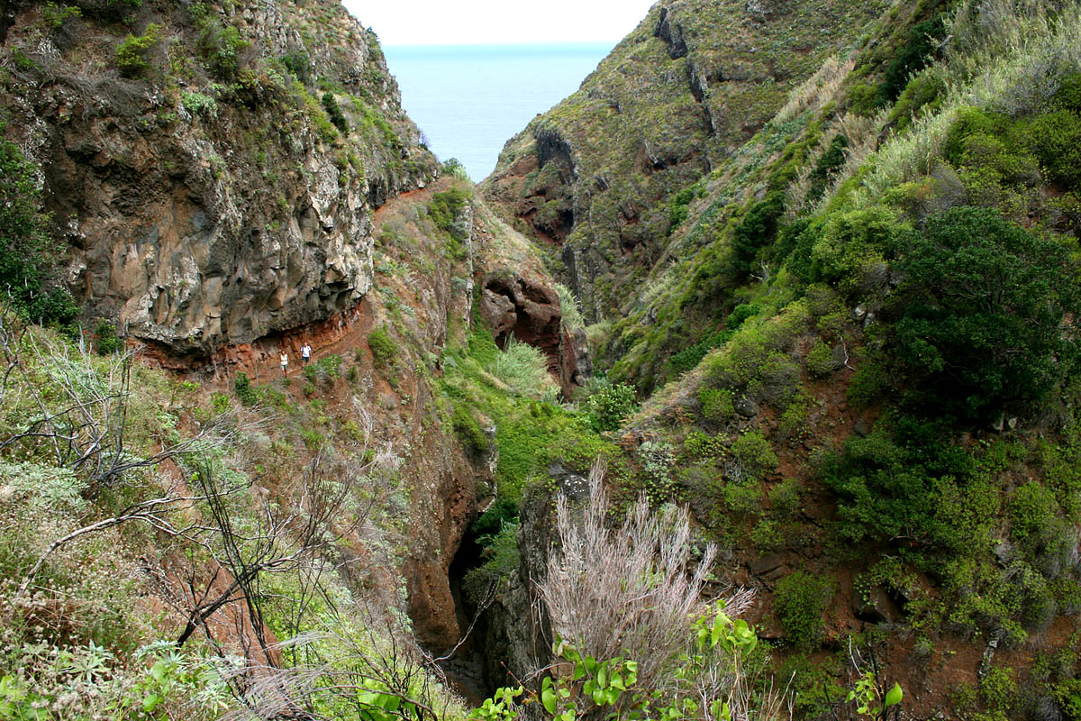 Zur Quebrada Nova im Westen der Insel Madeira führt ein schmaler Fußweg über 550 Höhenmeter zum Meer hinunter. Hier kann man die Entstehungsgeschichte der Vulkaninsel gut beobachten. Und für eine Bergwanderung ist es ungewohnt, zuerst über 500 m abzusteigen und dann wieder zum Ausgangspunkt hinaufzuklettern.