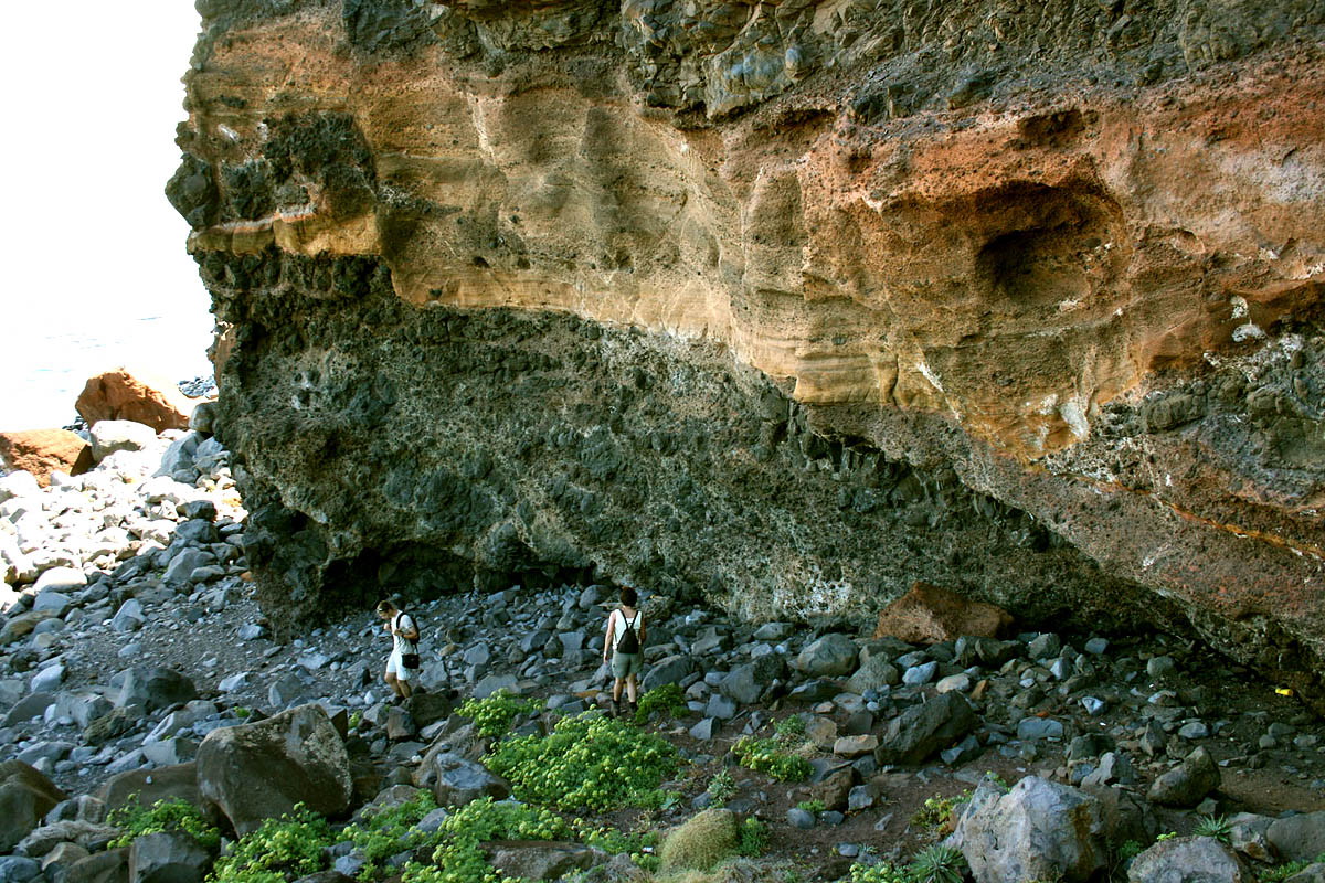 Am Strand kann man die Gesteinsschichten gut beobachten. Oben die gelbe Bimsschicht aus Vulkanasche, darunter die graubraune Lavaschicht und unter unseren Füßen der blauschwarze Basalt.