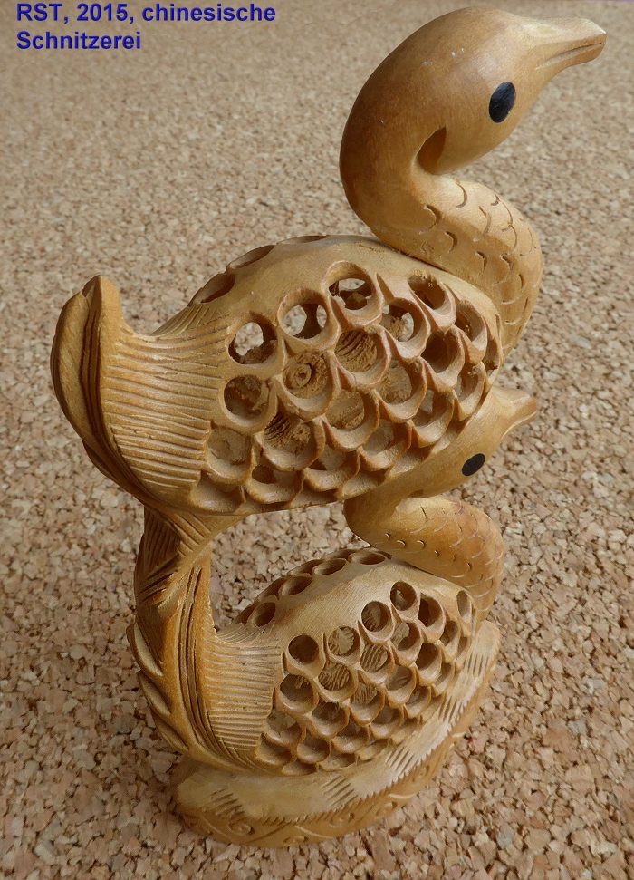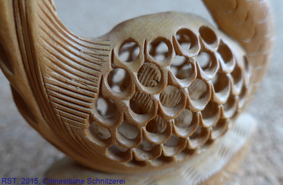 hierzulande vielleicht eher als Kitsch bewertet: Eine kleine Schnitz-Skulptur aus Holz. Schaut man genauer hin, wird aber zumindest ein gutes Stück handwerklicher Kunst erkennbar. Irgendwie hat es der Schnitzer (Fräser?) geschafft in die einteilige Skulptur innen noch zwei weitere Figurteile einzuarbeiten.