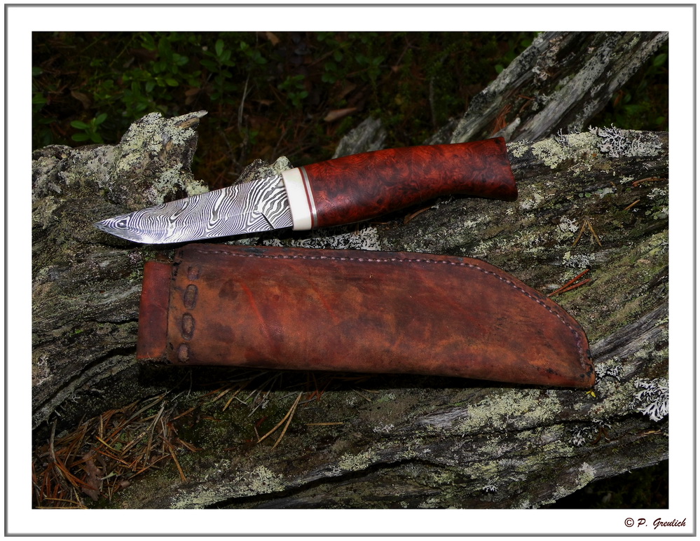 Hier mal eines der Messer, die ich im Laufe meiner Zeit in Schweden auf diese Weise hergestellt habe. Das Griffmaterial ist wie folgt aufgebaut: 1 Schicht = Elfenbein, angeblich Mammut, dann dunkelrotes Fiber - eine sog. Neusilberplatte - dann nochmal Fiber als Distanzmaterial. Der Hauptteil des Griffes allerdings besteht aus Amboina, dem Wurzelholz des südostasiatischen Narrabaumes. Die Klinge hab ich einem dänischen Messerschmied abgekauft. Die Scheide fertigte ich aus einem ursprünglich glatten Sattlerleder, welche ich so lange mit Schmirgel bearbeitet und immer wieder mit verschiedenen Substanzen eingerieben hatte, bis sie meiner Vorstellung von Antikleder entsprach.
