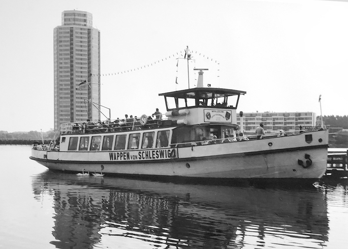 mit diesem Fahrgastschiff machte ich 1981 eine Ausflugsfahrt über die Schlei bis Schleimünde in Schleswig-Holstein, landschaftlich ein High Light. Das Hochhaus im Hintergrund (in der Schlei selbst liegend) hat eine bewegte Geschichte. Das 1927 in Königsberg als "Altstadt" gebaute Schiff ist seit 1968 auf der Schlei unterwegs wohl heute noch in Betrieb.