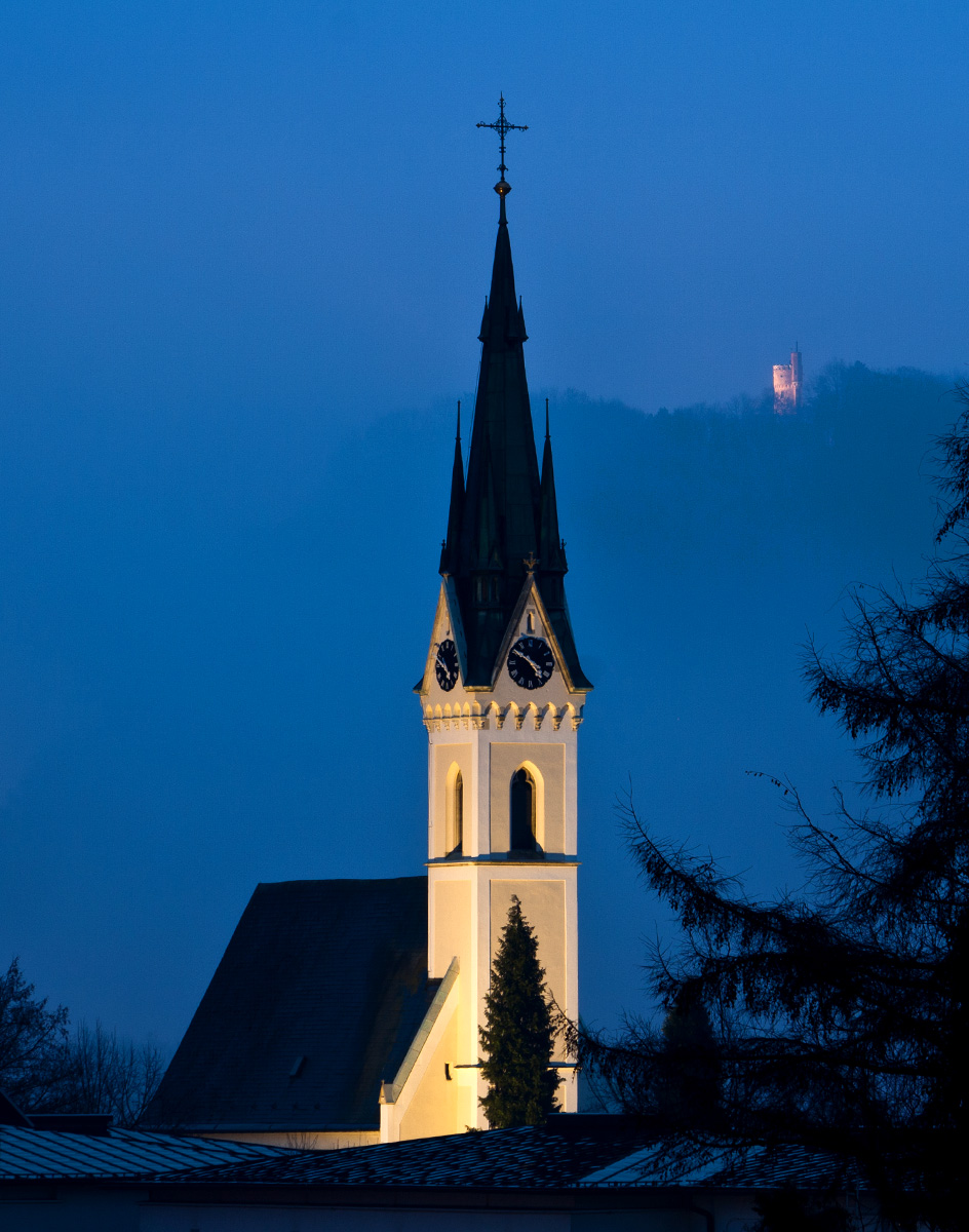 Bei Nacht ist der Turm beleuchtet und von der 4km entfernten Stadt Linz aus zu sehen. Canon EF 90-300mm