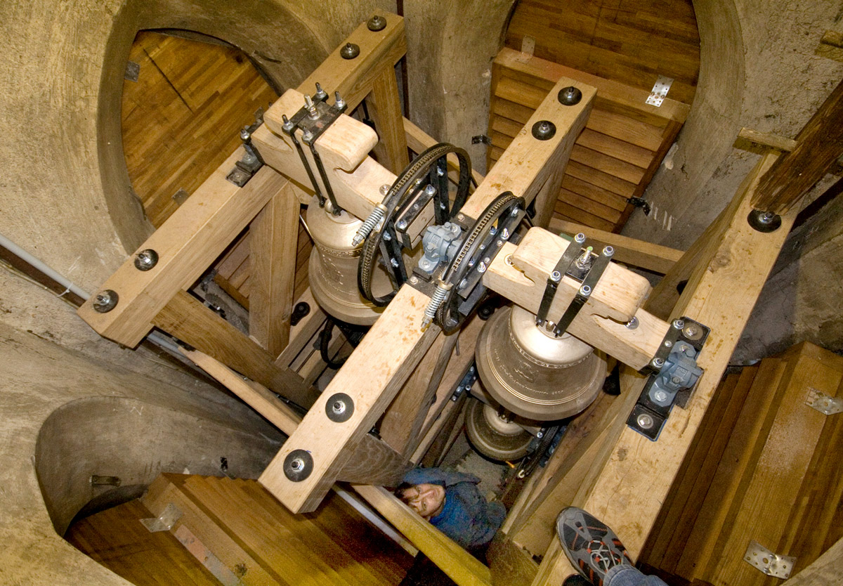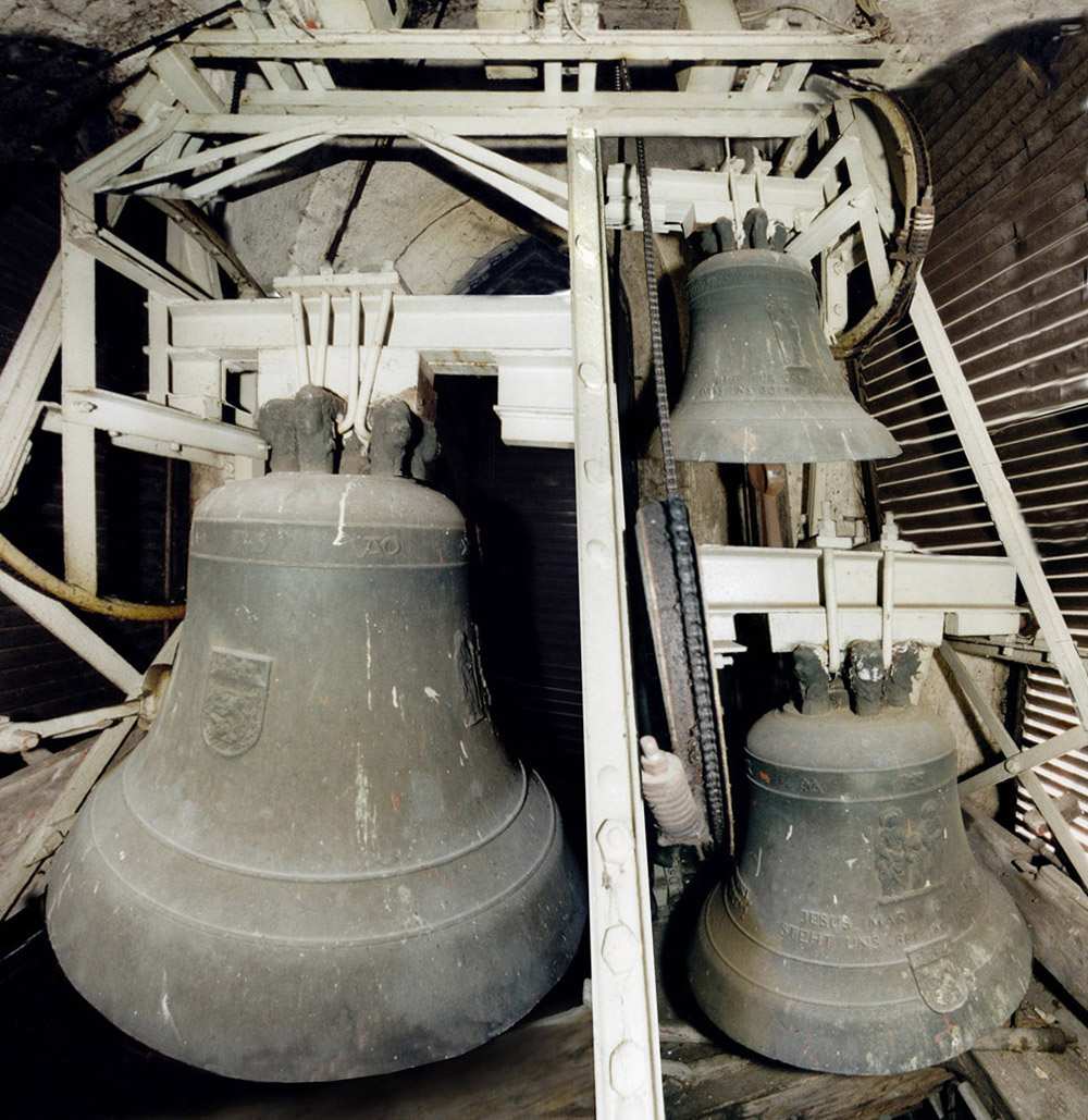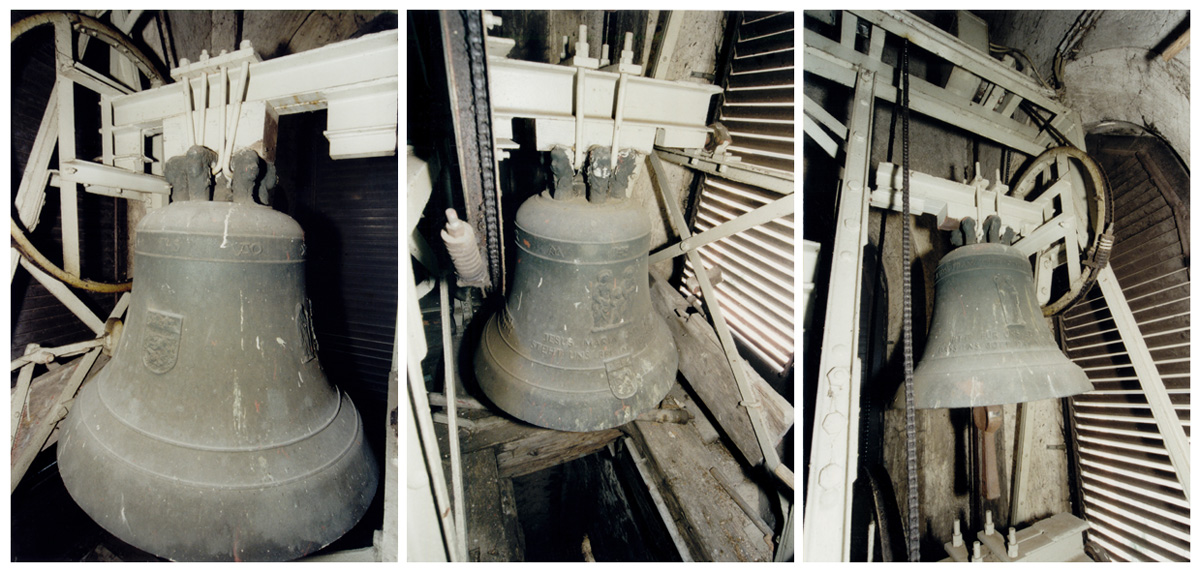 1950 wurden in der nur 1,6x1,6m großen Glockenstube drei große Glocken eingebaut. (wegen des geringen Aufnahmeabstandes aus mehreren Teilbildern zusammenmontiert)