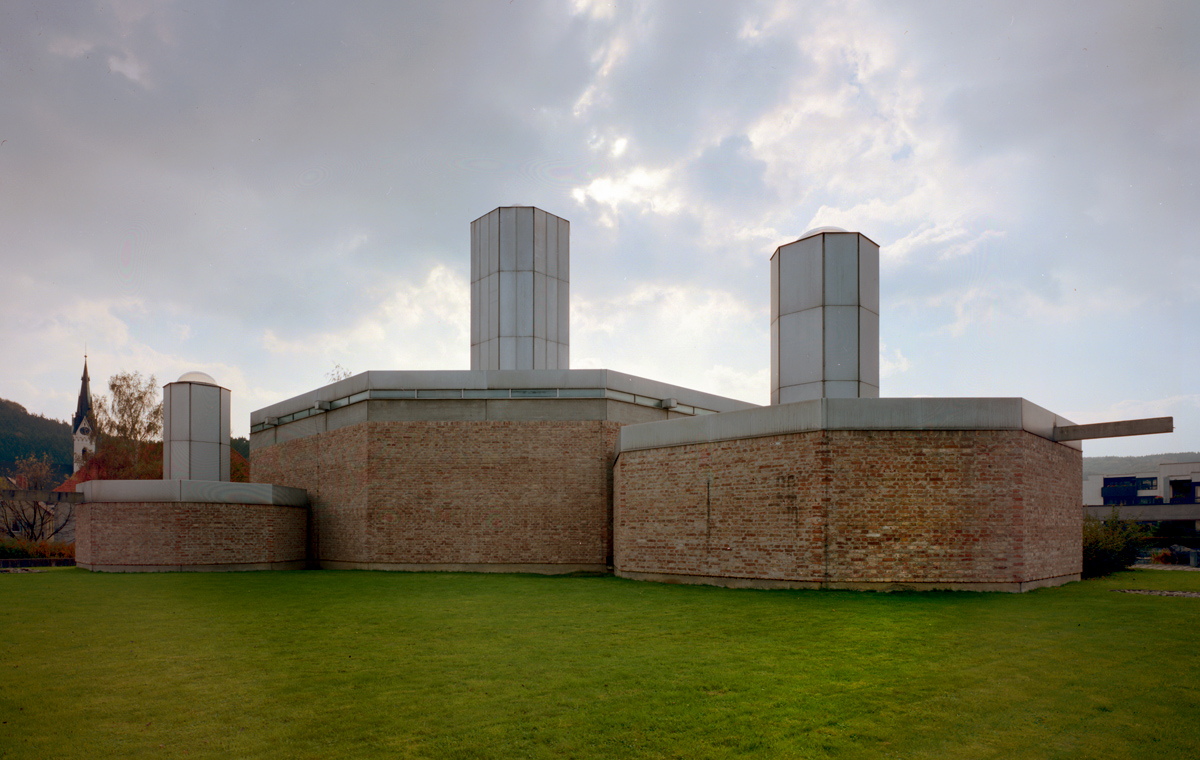 Der aus drei Oktogonen bestehende Sakralbau. Die Kirchenglocken in der alten Kirche werden vom Neubau aus ferngesteuert geläutet. Linhof Kardan 13x18cm, Super Angulon 1:5,6, 90mm, Kodak Vericolor III S
