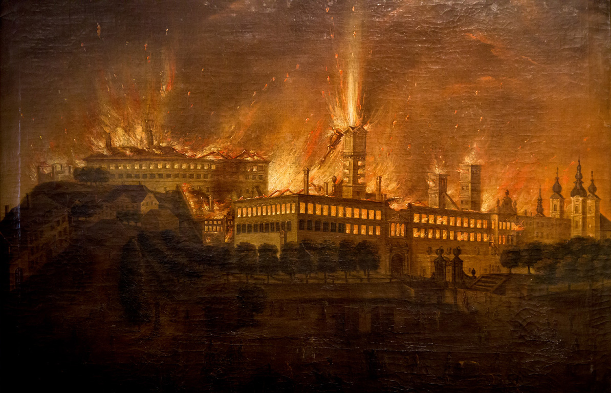 Am 15.8.1800 brannte das Schloss ab. Das Feuer konnte über einen hölzernen Gang zur Stadt auch diese erfassen und das Landhaus und die gesamte westliche Altstadt wurde ebenfalls ein Raub des Flammen.