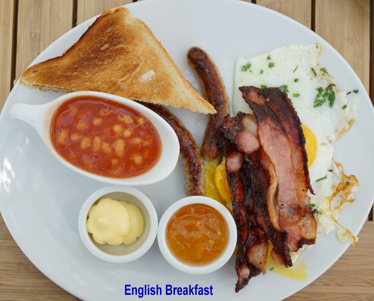 ein mir gereichtes English Breakfast. Obwohl der Schickenspeck etwas kräftig gegrillt, trieb es der Hunger in mich hinein. Bäuerchen !