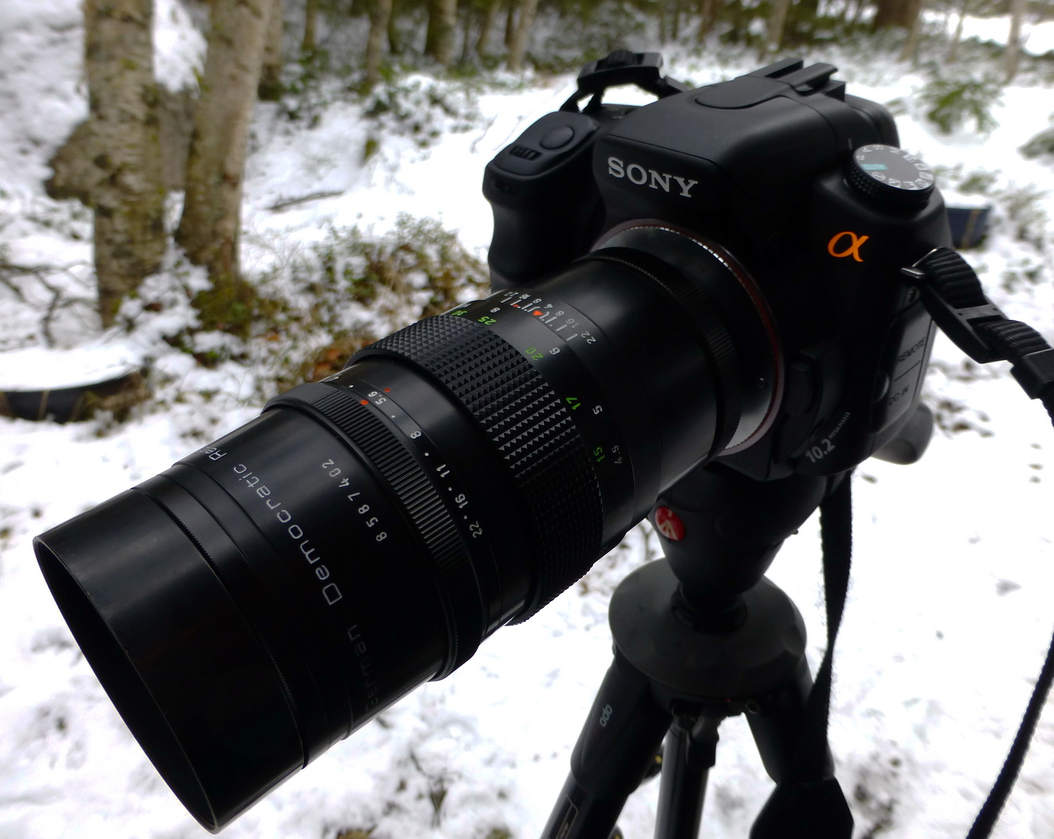 interessant (wegen des Bildwinkels und der Objektiveigenschaften der zur Aufnahme verwendeten Kamera) bei der Aufnahme des PENTACON 4/200 mit M42 Adapter, finde ich das scheinbare Herunterhängen des Objektivrohrs.