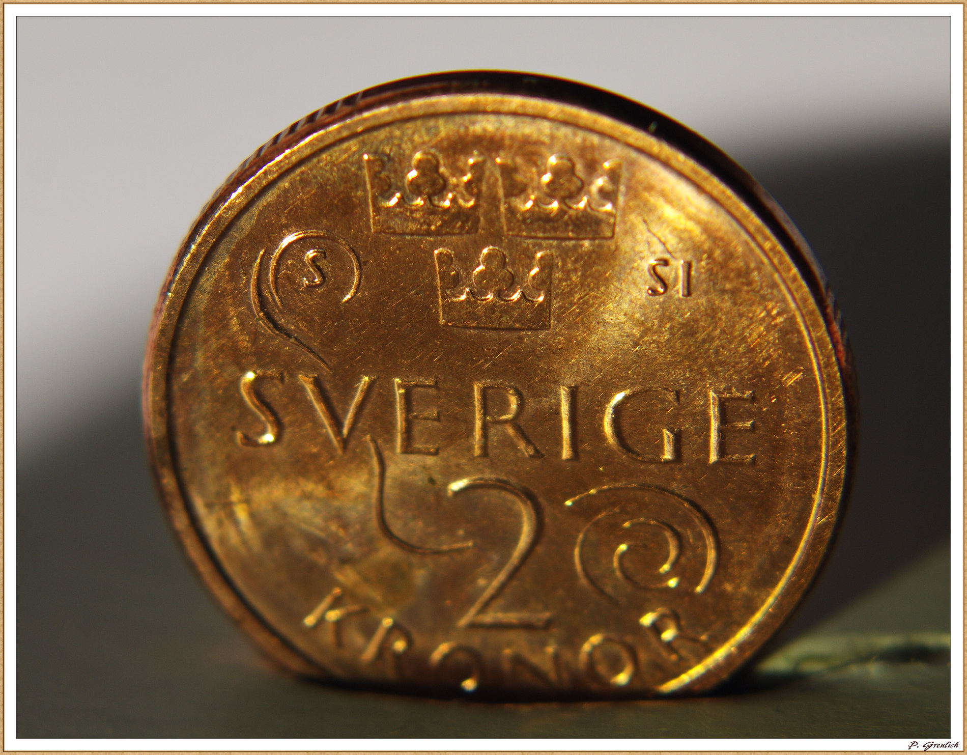 Fotografiert frei Hand bei Blende 8. Angestrahlt von einer Taschenlampe, da das Licht des eingebauten Kamerablitzes durch die Länge des Objektives beschnitten wurde. Die Unschärfe im unteren Bereich der Münze erklärt sich durch die schräg im Papiersockel (Pappteller mit Einschnitt) stehende Münze. In den kommenden Tagen werde ich ein paar Outdoor- Tests bei Blende 11 durchführen.