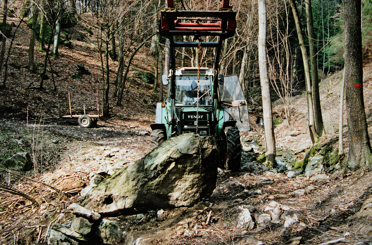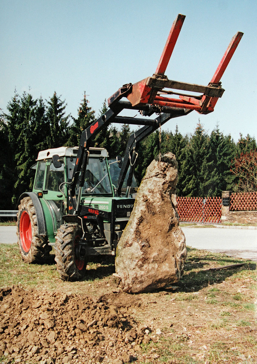 Einbau des Steines am neuen Standort, treffend im Ortsteil "Gattered"
