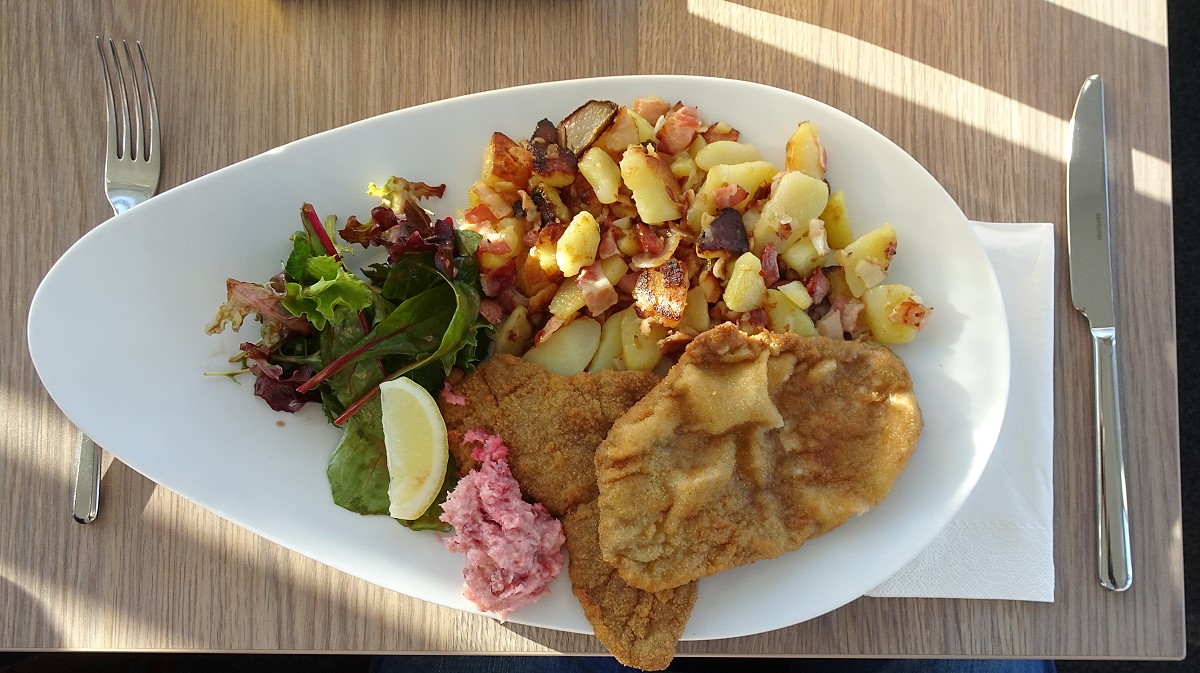 zugegeben, Wiener Schnitzel ist eine meiner Leibspeisen und kommt somit hier in meinen Beiträgen dieses Threads wiederholt vor, aber so ist das nun mal. Das hier gezeigte Schnitzel war gut und schmackhaft. Man konnte zwischen warmen Kartoffelsalat und Bratkartoffeln wählen.