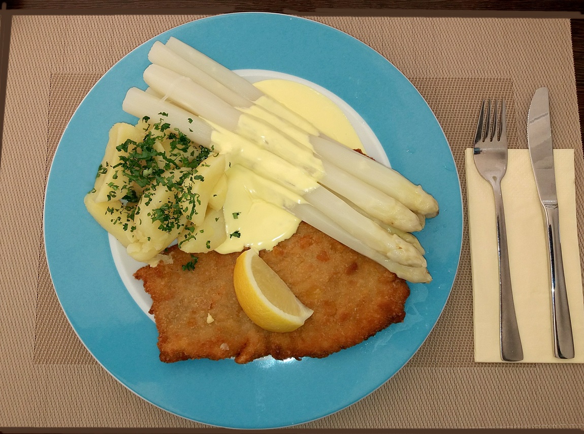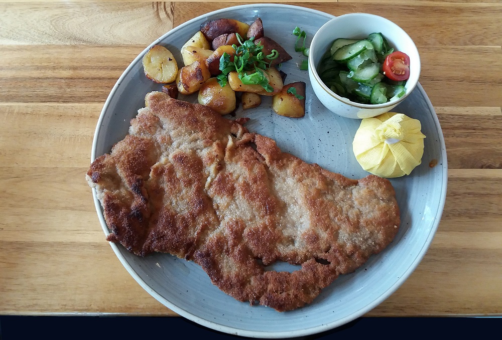 Verzehrt in einem Berliner Restaurant mit dem Wort "Schnitzel" im Namen, direkt am Ufer der Spree, draussen auf der Terrasse.