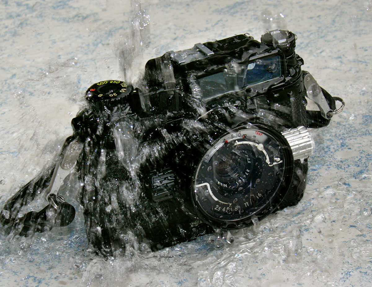 Die wasserdichte Nikonos III war meine Lieblingskamera für besonders raue Einsätze bei Regen, Staub oder richtigen Dreck. Nachdem die Bilder im Kasten waren konnte man sie vor dem Entnehmen des Films einfach abwaschen. Nur einen wasserdichten Belichtungsmesser gab es nicht dazu. Dazu war ein Sixtino in einer Kunststoffbox dabei.