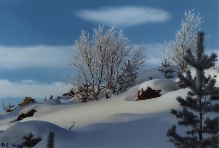 Von mir auch mal ein Winterbild. Ich weiss nicht mehr genau, was das für eine Kamera/Linsenkombination war. Das Bild ist etwa 15 Jahre alt. Es war im Februar und ich war auf selbstgebastelten Schneeschuhen bei minus 25 Grad durch die nähere Umgebung gestreift, hatte die Kamera unter meinem Parka. Nur für diese eine Aufnahme hatte ich sie der Witterung ausgesetzt. Und die Elektronik funktionierte, wie man sieht.