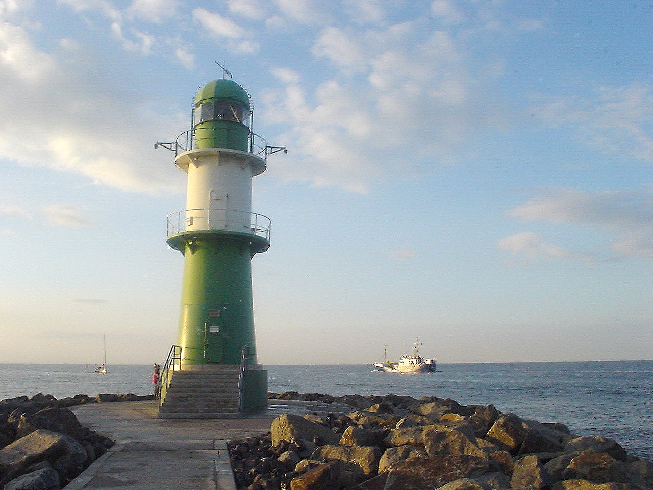 hier muß ich einen kleinen Einspruch einlegen. Der Leuchtturm in Warnemünde ist meines Wissens nach durchaus noch in Betrieb und im Dienst der Schifffahrt. Es gibt auf Wikipedia eine "Liste von Leuchttürmen Deutschlands" wo man das nachschauen kann. Unter anderem ist dort in einer Spalte die Kennung, also die individuelle Abfolge und Dauer der Lichtzeichen, die der Turm abstrahlt, angegeben. Ist der Turm nicht mehr in Betrieb, steht dort "gelöscht". Warnemünde hat dort noch eine Kennung. "Ich blinke, also bin ich"