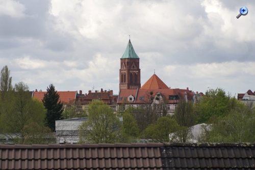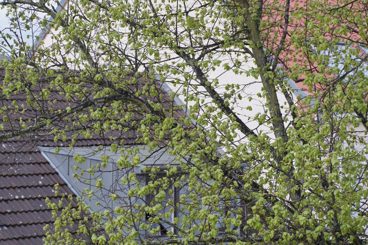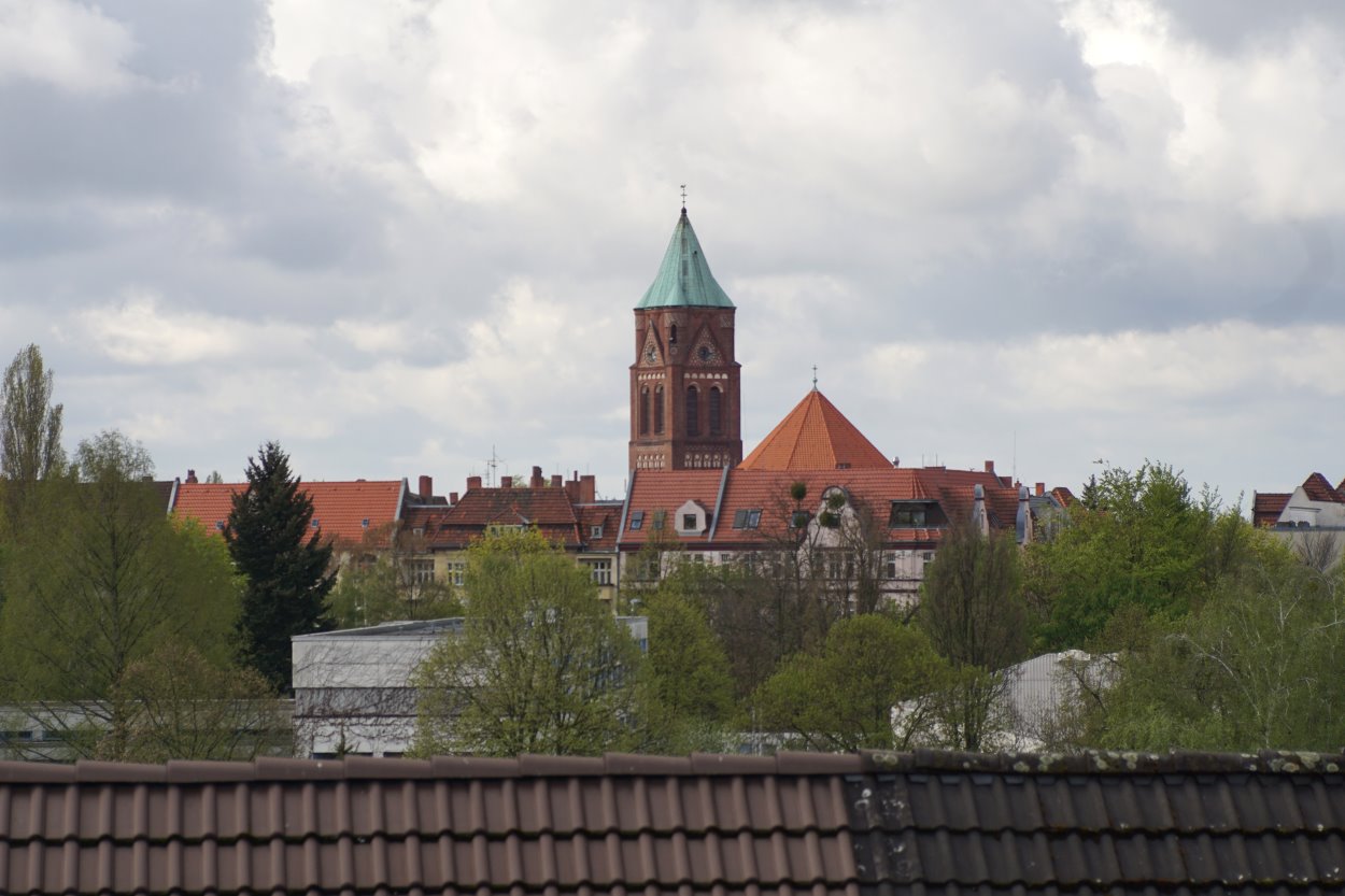 unendlich Fokus auf Kirchturm. Dach im Vordergrund ca 12 Meter. Eine leichte Gesamtunschärfe vorhanden.