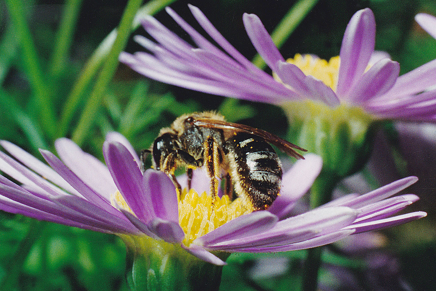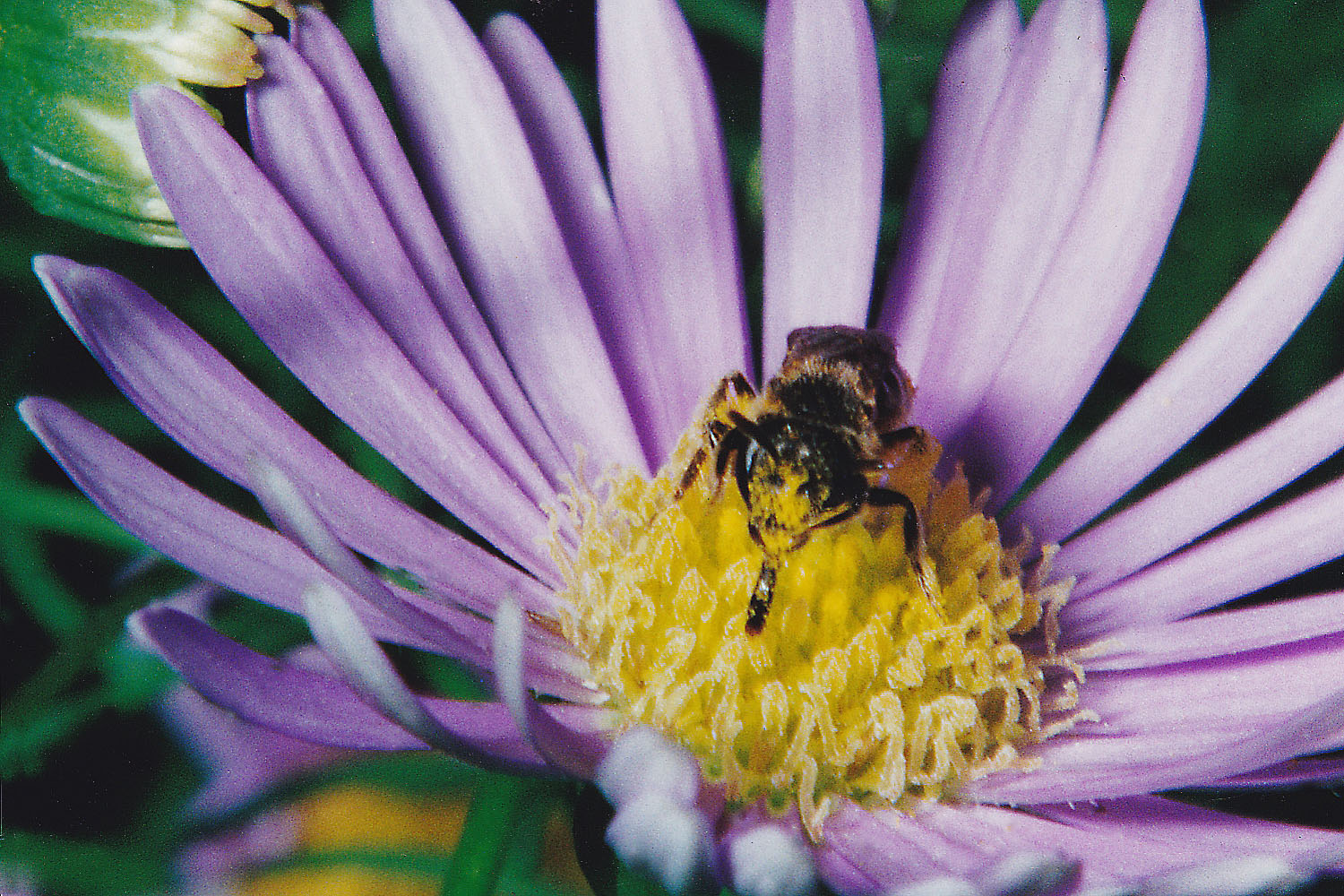 Der Hinweis auf das Stativ war natürlich nur für die Flechtenaufnahmen gemeint! Danke für den interessanten Bericht über deine und deines Sohnes Insektenfotografie. Wäre schön einige der Bilder hier im Forum zu den Makrobildern zu sehen. Welche Insektengattungen fotografiert ihr? Ich habe ja selber früher noch zur Analogzeit, sehr viele Insektenbilder, vor allem der Wildbienen Lasioglossum angefertigt. Einige Habe ich jetzt gescannt um sie hier zu zeigen. Die Blüte hat einen Durchmesser von ca 2 cm, die winzigen Furchenbienen sind nur ca. 8 mm groß. Fotografiert am 10.6.1993.