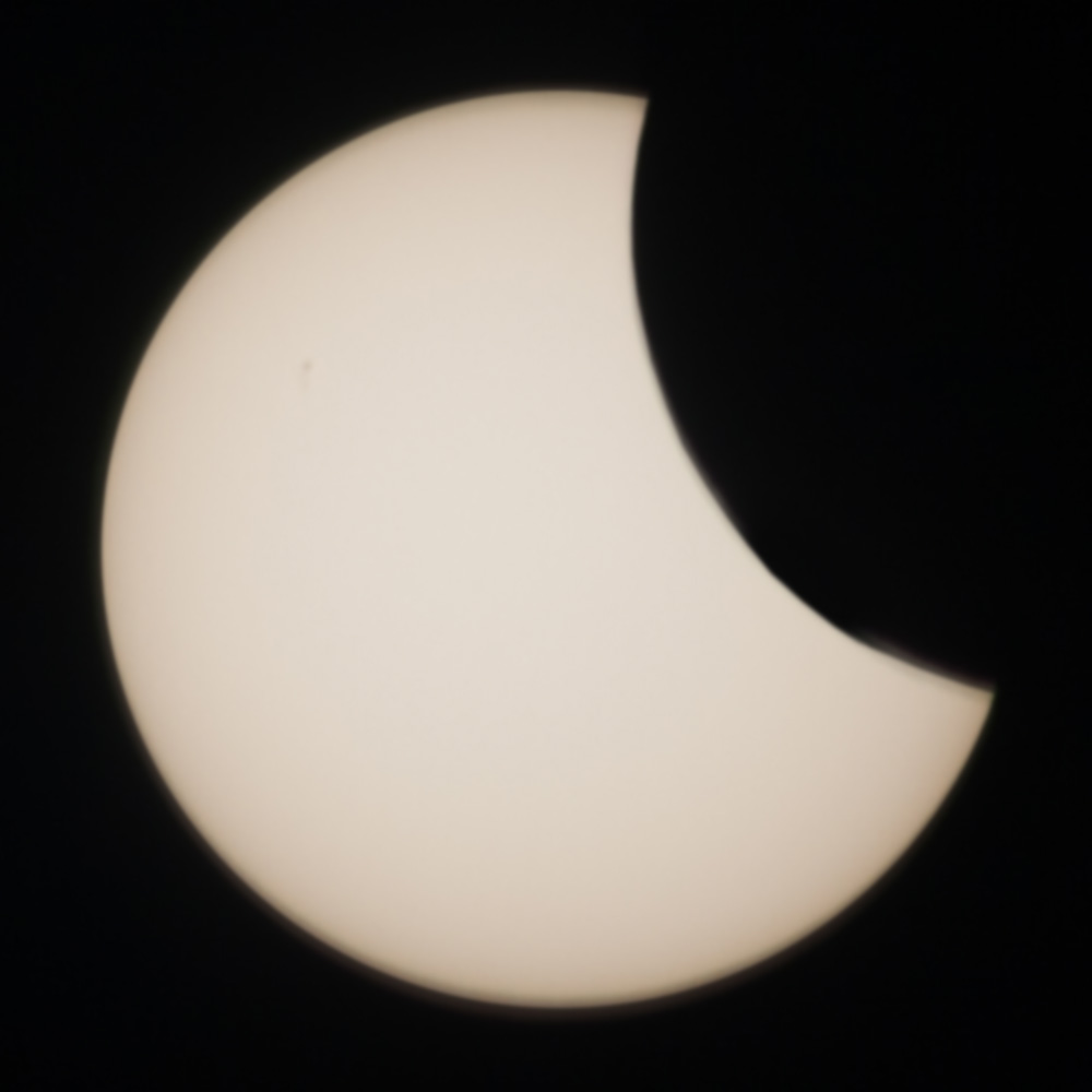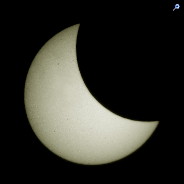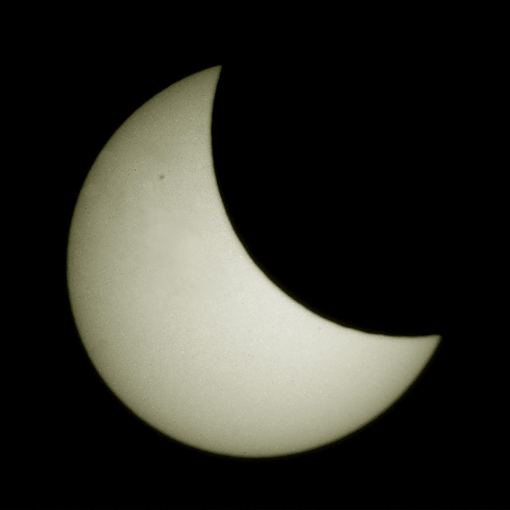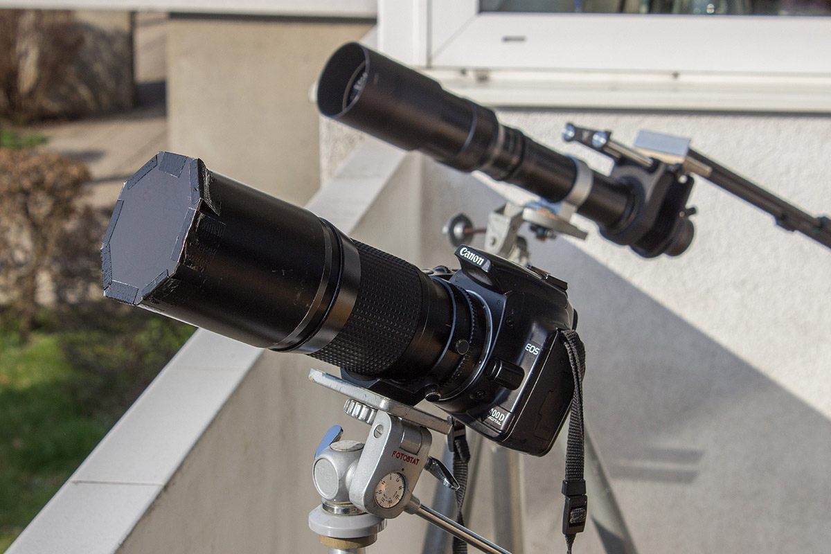 Ich hab natürlich Filterfolien mit T3 zum Photographieren und T5 zum Beobachten noch von der totalen Sonnenfinsternis von 1999 in meinem Fundus. Das Problem war nur, dass ich vor einigen Jahren dienstlich Großaufnahmen von Lichtbögen für einen Schweißgerätehersteller angefertigt habe. Dass die Folien dabei unzählige winzige Löcher erlitten haben, merkte ich erst am Tag vor der letzten Sofi. Der kleine örtliche Astrozubehörhändler war da natürlich schon Ausverkauft. Eine Schweißscheibe erwies sich als ungeeignet. Das Sonnenbild ist giftgrün und sehr warm weil ja nichts reflektiert wird wie bei der Filterfolie. Die komplett schwarze Photoplatte aus den 1960er Jahren hat bei abgeblendetem Objektiv ein brauchbares Bild ergeben. Das Objektiv war permanent auf 16 abgeblendet und stellte so auch keinerlei Gefahr für den Aufnahmechip der EOS (und mein Auge) dar. Die Kamera war auch nicht permanent auf die Sonne ausgerichtet. Einzig die Schärfe hat durch die Kornstruktur der Silbergelatineschicht erheblich gelitten.