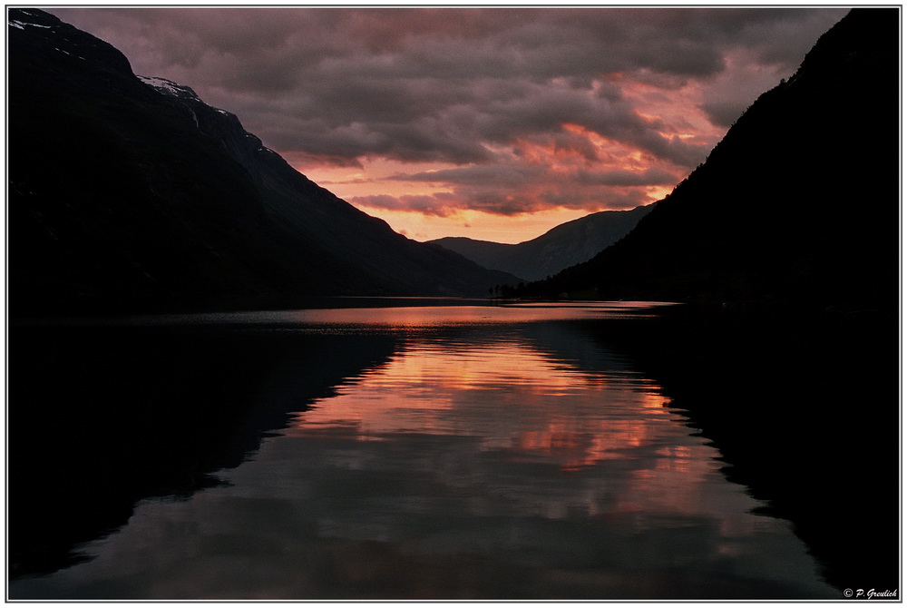 Kamera: Nikon F100 Objektiv: AF Nikkor 20-35mm f2.8 Film: Kodak Portra 160 Blende: 11 Zeit: Keine Ahnung, da Zeitautomatik Stativ und Kabelauslöser waren natürlich auch dabei Ort und Zeitpunkt der Aufnahme: Mitte Juni 2013 in Lodalen/ See Lovatnet in Norwegen, Nähe Loen