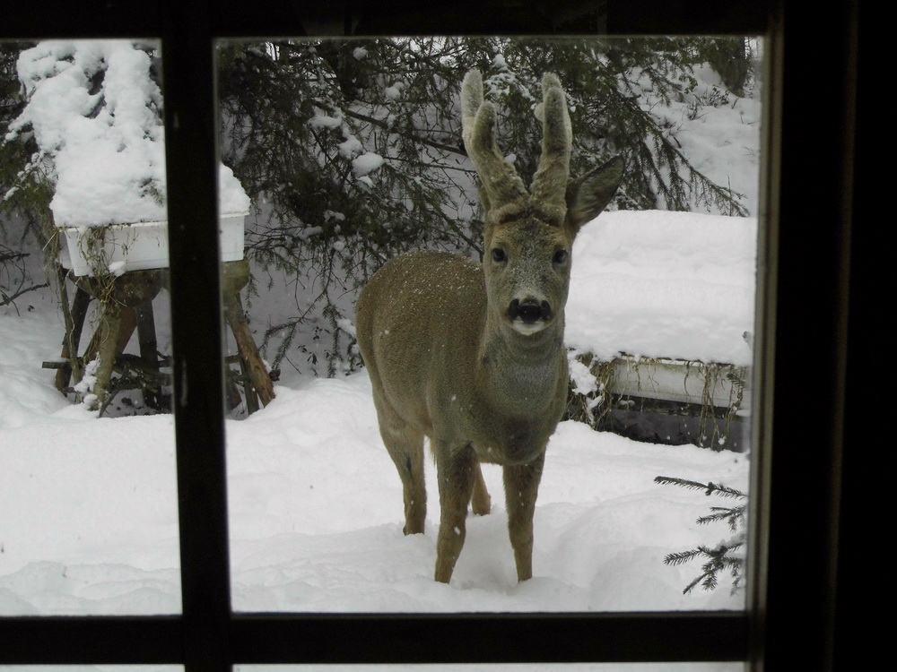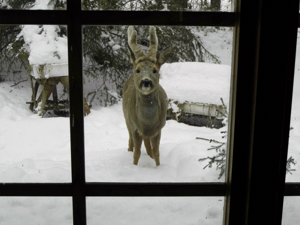 Wie dem auch sei. Ich beginne diese Reihe mal mit einem Foto von einem befreundeten, schwedischen Rehbock. Ich habe ihn Heinrich genannt. Er kommt im Winter regelmäßig vorbei und holt sich einen kleinen Snack ab. Er mag Äpfel, gekochte Kartoffeln, Sauerteigbrot und geriebene Möhren. Das meinte ich mit dem Titel "Heinrich kommt zum Essen". Er kommt also als Gast und nicht als Mahlzeit. Seit drei Jahren kenne ich Heinrich und im Laufe der Zeit wurde er immer zutraulicher. Rehbraten habe ich seitdem nicht mehr gegessen. Ich würde mir dabei auch wohl wie eine Art Kannibale vorkommen.