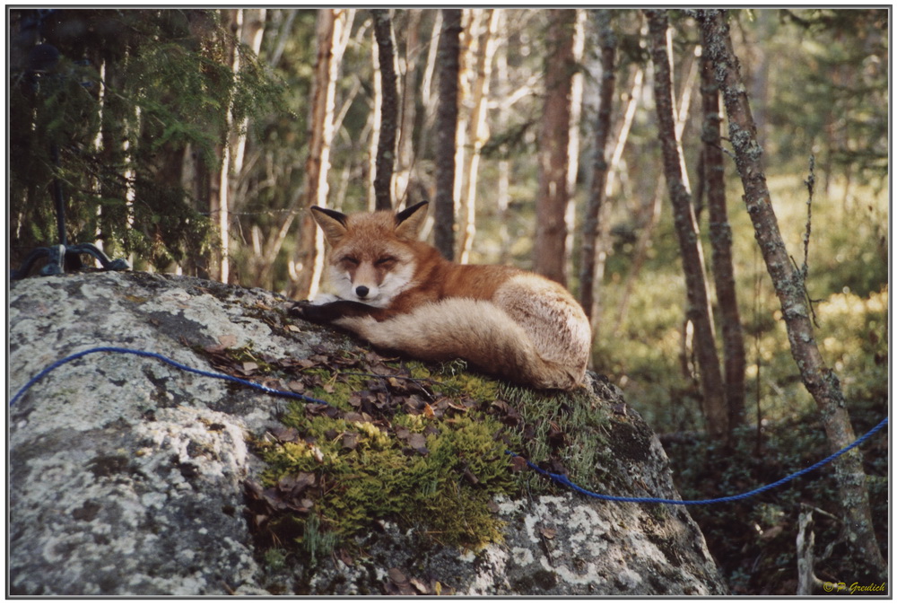 Auf dem Bild liegt er auf dem Findling vor unserem Haus und relaxt. Einige von Euch sagen jetzt sicher: "Die blaue Schnur stört aber doch sehr das Bild". Gut, okay, das ist sicher Ansichtssache. Ich fand damals - und eigentlich finde ich es immer noch - dass sie dazu gehört. Am Tag zuvor verlief sie noch straff gespannt über den dicken Stein. Ich hatte damit eine Plane abgespannt, um somit den Grillplatz seitlich vom Stein zu überdachen, denn es hatte geregnet. Den Fuchs hatte das gestört, er wollte dort ja liegen, also hatte er sie durchgeknabbert.