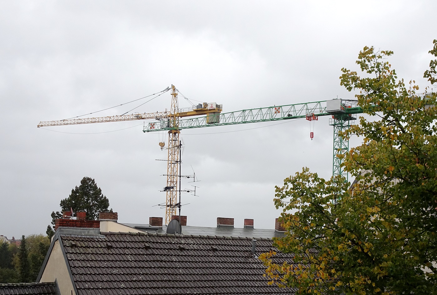 eine unerwartete Wendung bei der Beobachtung der Baukräne der vorigen Fotos. Taucht doch Jemand auf dem Dach im Vordergrund auf und baut die Jahrzehnte dort befindliche terrestrische Fernsehdachantenne ab ...
