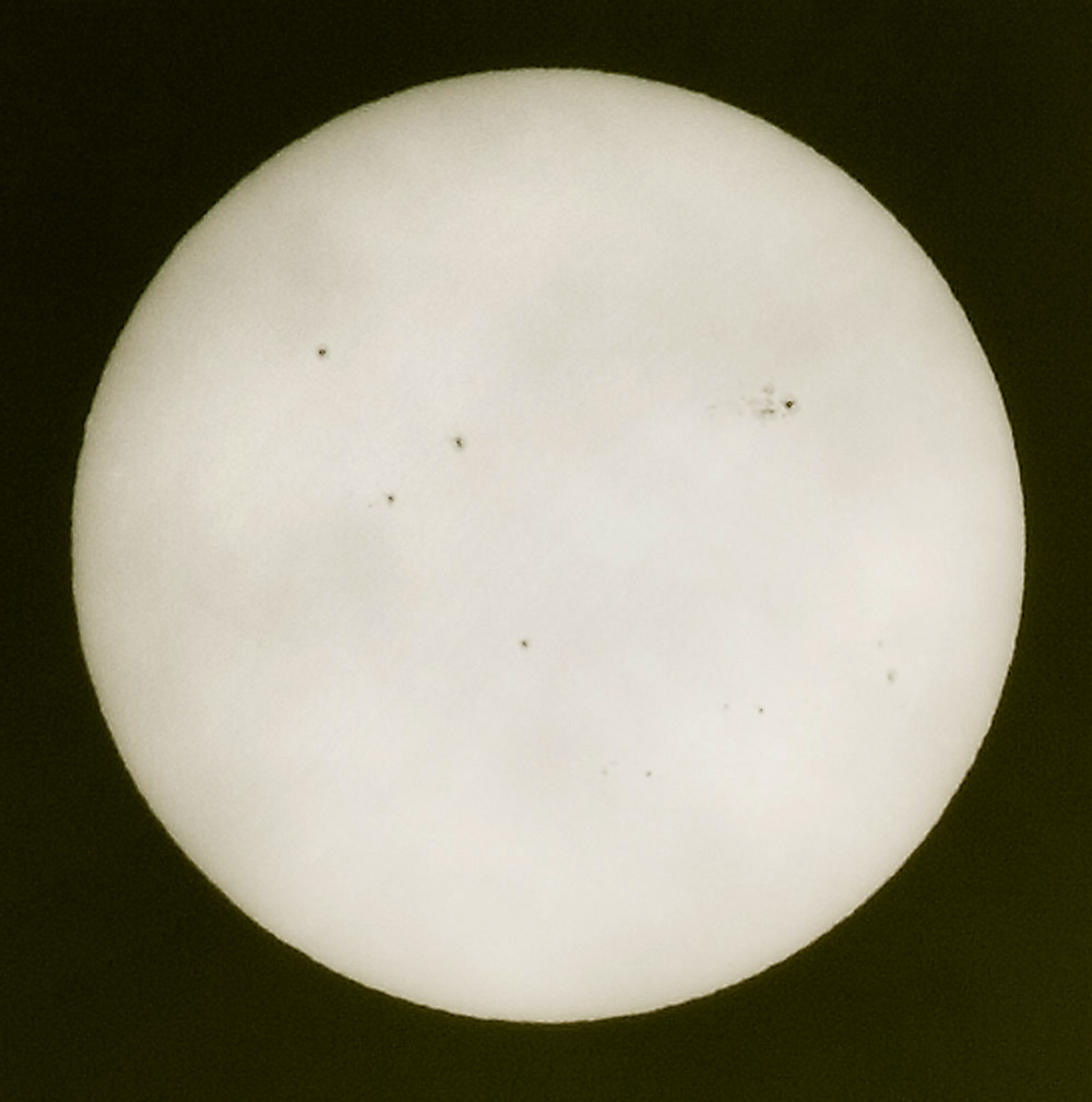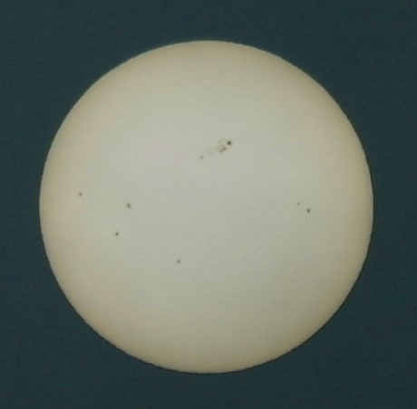Deutlich ist sogar die dunkle Umbra und die hellere Penumbra der Sonnenflecken zu erkennen. Gegenüber deiner Aufnahme von gestern ist auch die rasche Bewegung der Flecken über die Sonnenscheibe durch die Rotation der Sonne erkennbar!