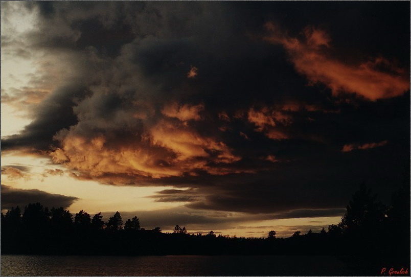 Eine Nachtaufnahme hab ich auch noch. Mitten aus einer schwedischen Sommernacht, Mitte der neunziger Jahre. Eine Zeit, wo ich noch für Geld abenteuersüchtige Leute durch weglose Wildnisgebiete führte. Wie sagt man zu solchen Gelegenheiten: Ich war jung und brauchte das Geld. Na ja, so ganz jung war ich da ja auch schon nicht mehr und hatte meine bürgerliche berufliche Karriere in Deutschland schon hinter mir. Freiwillig allerdings.
