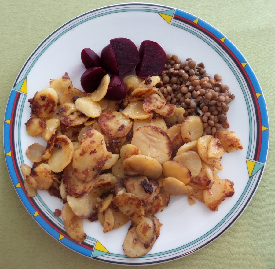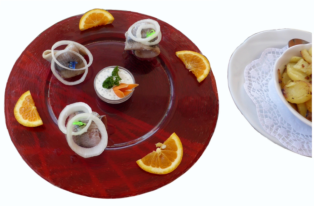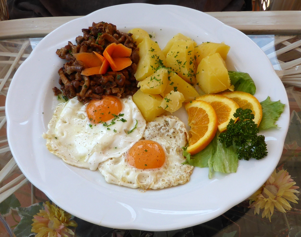 oft bin ich in dem Umland von Berlin unterwegs. Immer wieder kehre ich auch dabei in Restaurants und Gasthäusern ein. Bei einem Besuch eines rudimentär geführten Dorf-Gasthauses (weit und breit keine Alternative) wurde mir unter der Speisenkarte-Bezeichung "Fredys Bauernfrühstück" das folgende Gericht serviert: