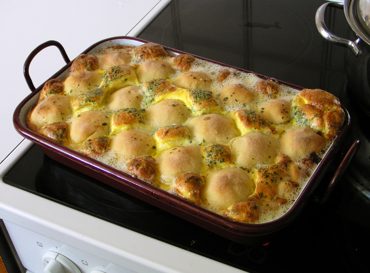 Die gebackenen Speckknödel meiner Frau sind schon fertig. Mit warmem Krautsalat natürlich