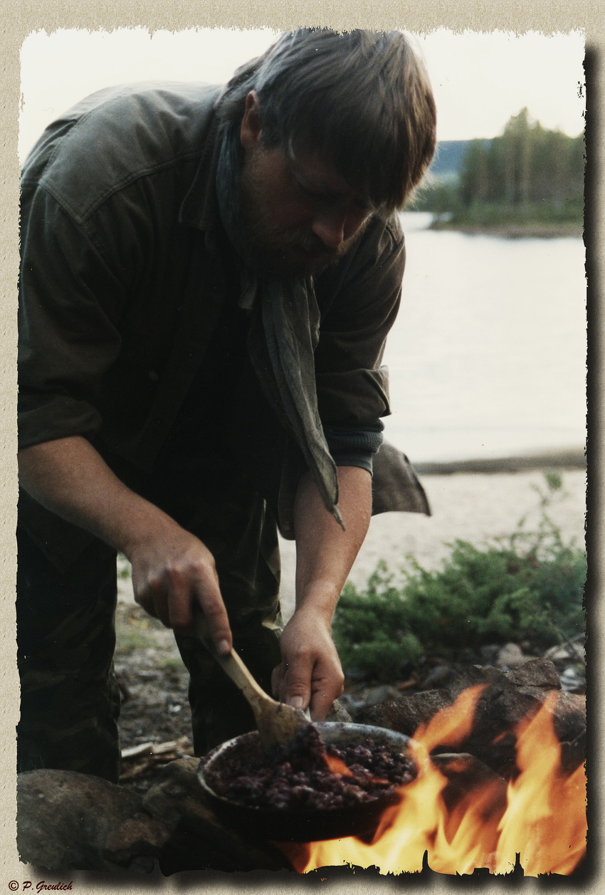 So...und jetzt mal Schluss mit lustig und gepflegter Esskultur (sofern man Currywurst noch dazu rechnen darf). In jedem Mann steckt noch ein Neandertaler, der gern am Feuer herumbrutzelt. So wird es jedenfalls immer gern von Kabarettisten und Komikern behauptet. Während unserer Touren mit Touristen konnte ich mich in dieser Hinsicht so richtig austoben. Dies Bild zeigt meinen Versuch, auf offenem Feuer Pfannkuchen mit frisch gesammmelten Blaubeeren herzustellen. Es ist dann aber eher so eine Art violettblauer Kaiserschmarrn geworden. Auch wenn er seltsam aussieht...geschmeckt hat das Zeugs trotzdem.