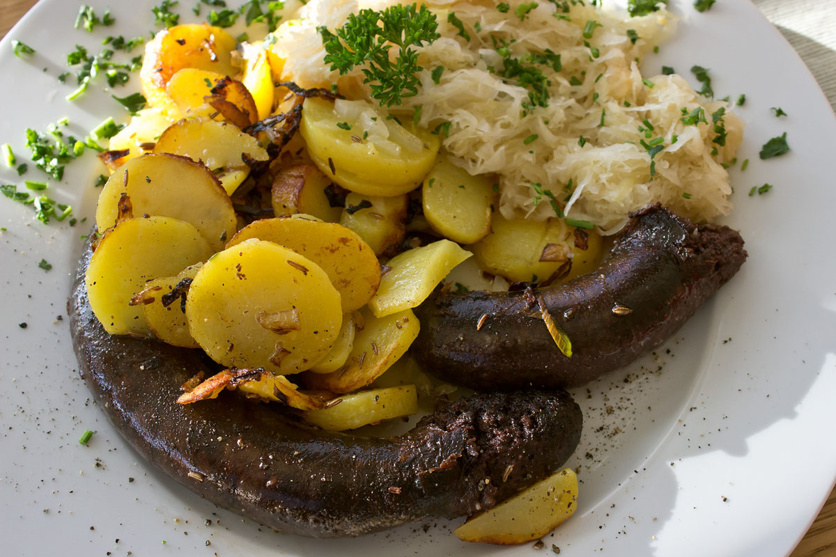 Wenns deftiger sein soll: Blunzen mit Erdäpfeln und Kraut (Blutwurst mit Kartoffeln)