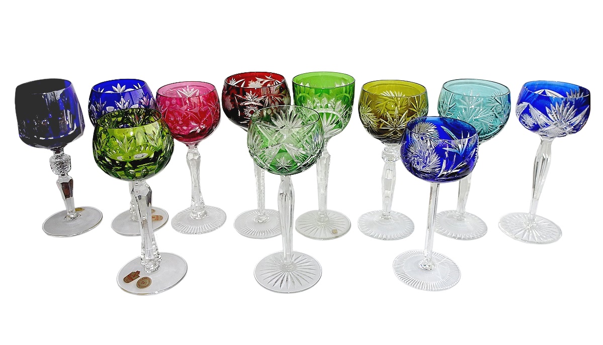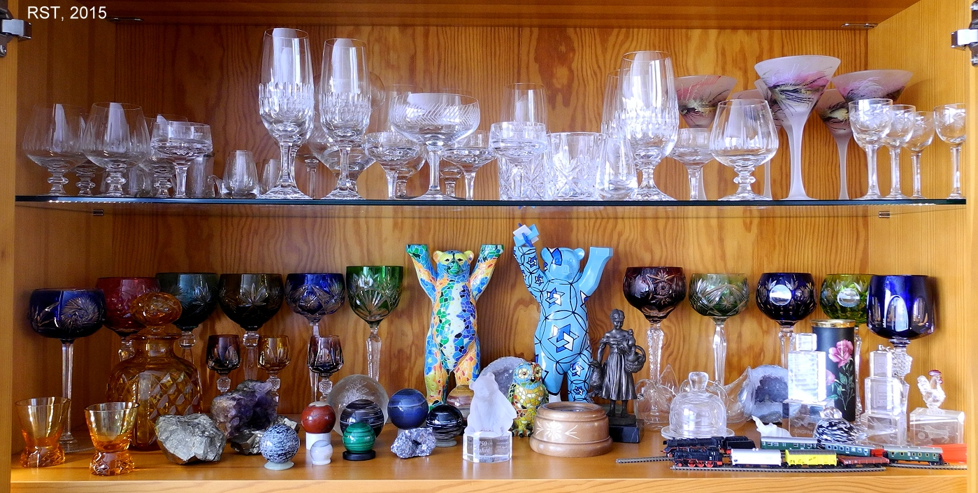 Glas? Gut, machen wir. Ein Blick in einen meiner "Nippes"-Schränke. Kitsch? Ja. Aber mir gefällt es. Die Römer stammen fast alle noch von meinen Eltern und werden in Ehren gehalten. Früher fand man diese bunter Gläser in vielen Haushalten, heute völlig out.